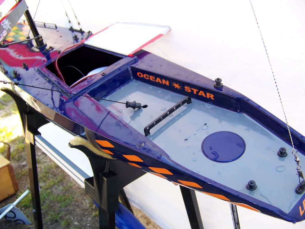 Jakmile jsem převzal Legend, šel jsem najisto vylévat vodu. Bylo jí tam odhadem dva litry, a proto bylo servo kormidla i s navijákem napůl pod vodou. Skrz přijímač se též provalila nějaká voda a ledabyle uložený čtyřčlánek se koupal celý. Ani se nelze divit, že model nejevil poslušnost. Kudy voda protékala, se ukázalo záhy. Plastová průchodka otěže vratiplachty byla vytržená z paluby, čímž na hojně zaplavovaném místě vznikl otvor o průměru nějakých 6 mm. Z dalších škod jsem zaregistroval vytržená kormidelní kola, která se jen zázrakem zachytila do otěží. Na levoboku chybí plastový úvazník a též lze vidět pár odřenin. Domnívám se, že k těmto škodám došlo při nárazu s Endeavourem, jen ta průchodka otěže možná povolila díky nějakému větrnému poryvu. Opravdu nevím.
