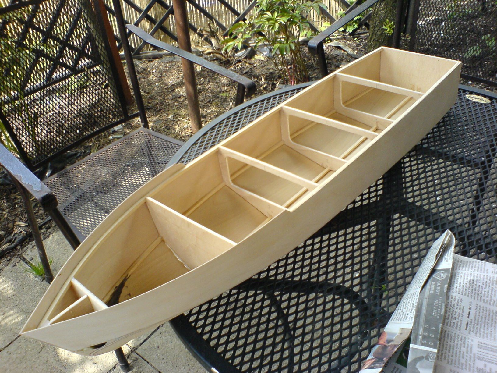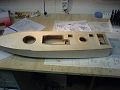 Rozhodl jsem se pro klasiku, jak je popsána v návodu. Žebra okopírována na papír a nalepena na překližku 4mm.(foto 1). Stavba provedena na desce dnem vzhůru. Lišty použity 5x5mm. Potah udělán z voduvzdorné překližky 1mm(foto3). Příď po druhé žebro je uděláno vodotěsné a „vycpáno pěnou“ snad to pomůže, pokud se snad……… No a nyní nastalo dilema, jak na palubu dvě dělové věže? Nebo kaťuše? Samozřejmě po poradě se synkem je jasno! Rakety! (ještě že je na koho to svést) Tak je rozhodnuto, to jsem ještě netušil, co mě čeká. Paluba z překližky 1,5mm vyvrtána, vyřezána a olemována. (foto 4)Pohon byl po probrání na chatu MoNaKa jasný 2x 600.(foto5)