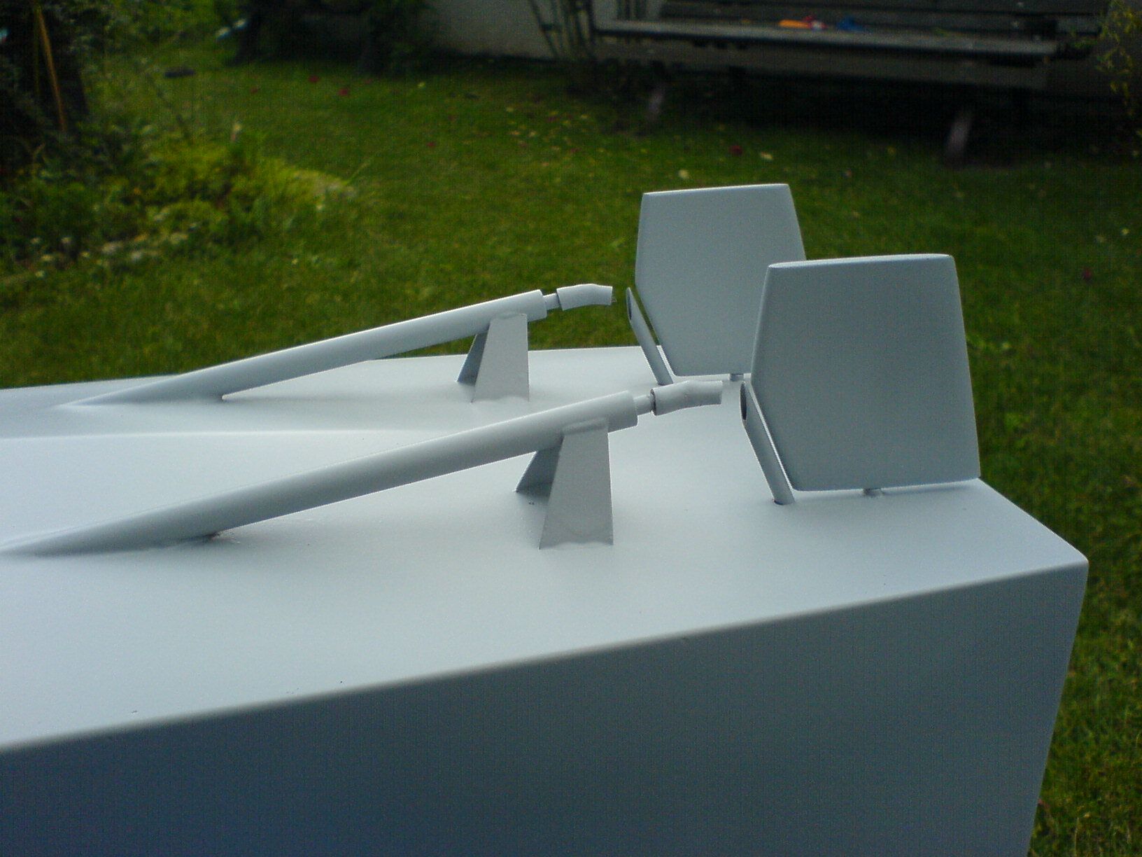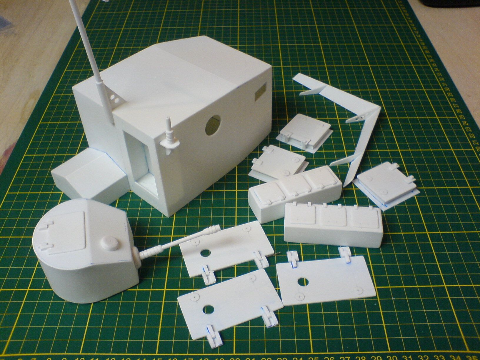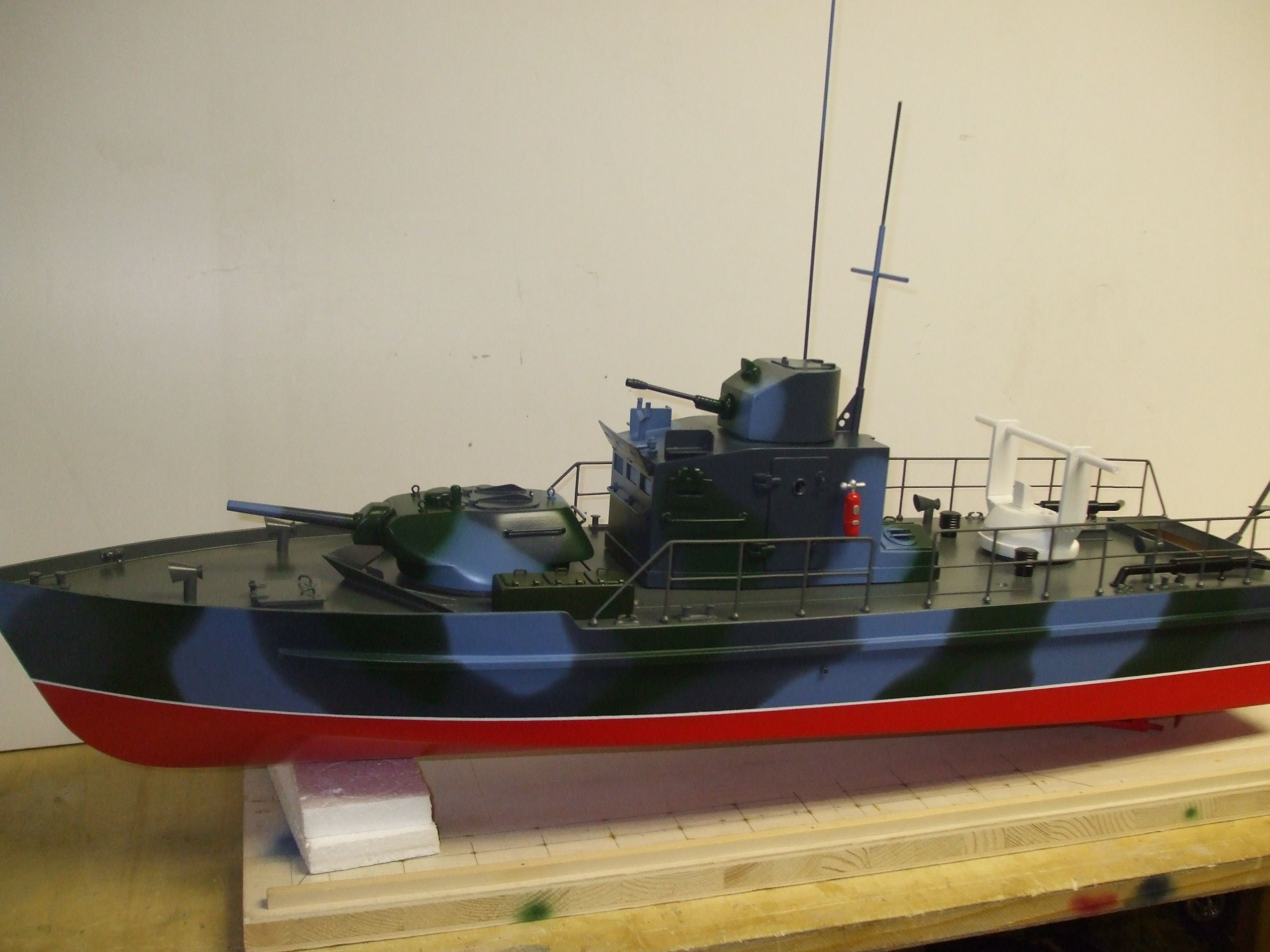 Na nástavby jsem použil materiál PSH síla 1.3mm. Krásně se řeže lámacím nožem a při zabrušování nevzniká prach. Lepení je provedeno vteřinovým lepidlem a Toluenem. Nezapomenout větrat, jinak je to horší než pár piv!! (foto16) Dělová věž slepena z PSH 5mm a pilníkem opracována do tvaru. Doplňky ze slabšího materiálu.(foto 17) Po zabroušení a vykytování (Miliput tmel) a stříknutí všech vrstev to vypadá následovně.(obr 18) Stále ale nejsou hotové kaťuše. Kde koupit profil I ? Jasně firma Litomyský má výběr snad všeho co se dá. Po pár dnech jsou doma. Začalo řezání a vrtání.(foto22) Rakety jsou udělány dřevěné kulatiny o průměru 8mm. Soustruženy ve vrtačce, stabilizátory z PSH vlepeny vteřináčem.(foto26) Elekro vybavení se sládá ze dvou Dsysu 30A, mixu, výkonového spínače to z důvodu že vypínač je umístěn v nástavbě za zadními dveřmi a je pouze 1Ampérový.(foto28) Spojení z nástavby je provedeno 7mi kolíkem. No, a protože zůstali dvě Kaťuše a je škoda je nechat ležet vznikla tato bedna.(foto 29). První plavba proběhla na Splaviskách a celkem úspěšně alespoň podle kapitána.(foto 31) Pokud začínáte stavět lodičky tak tento model je velmi vhodný pro začátek. Tak a nyní hurá na Přeříze.