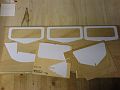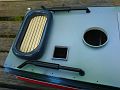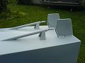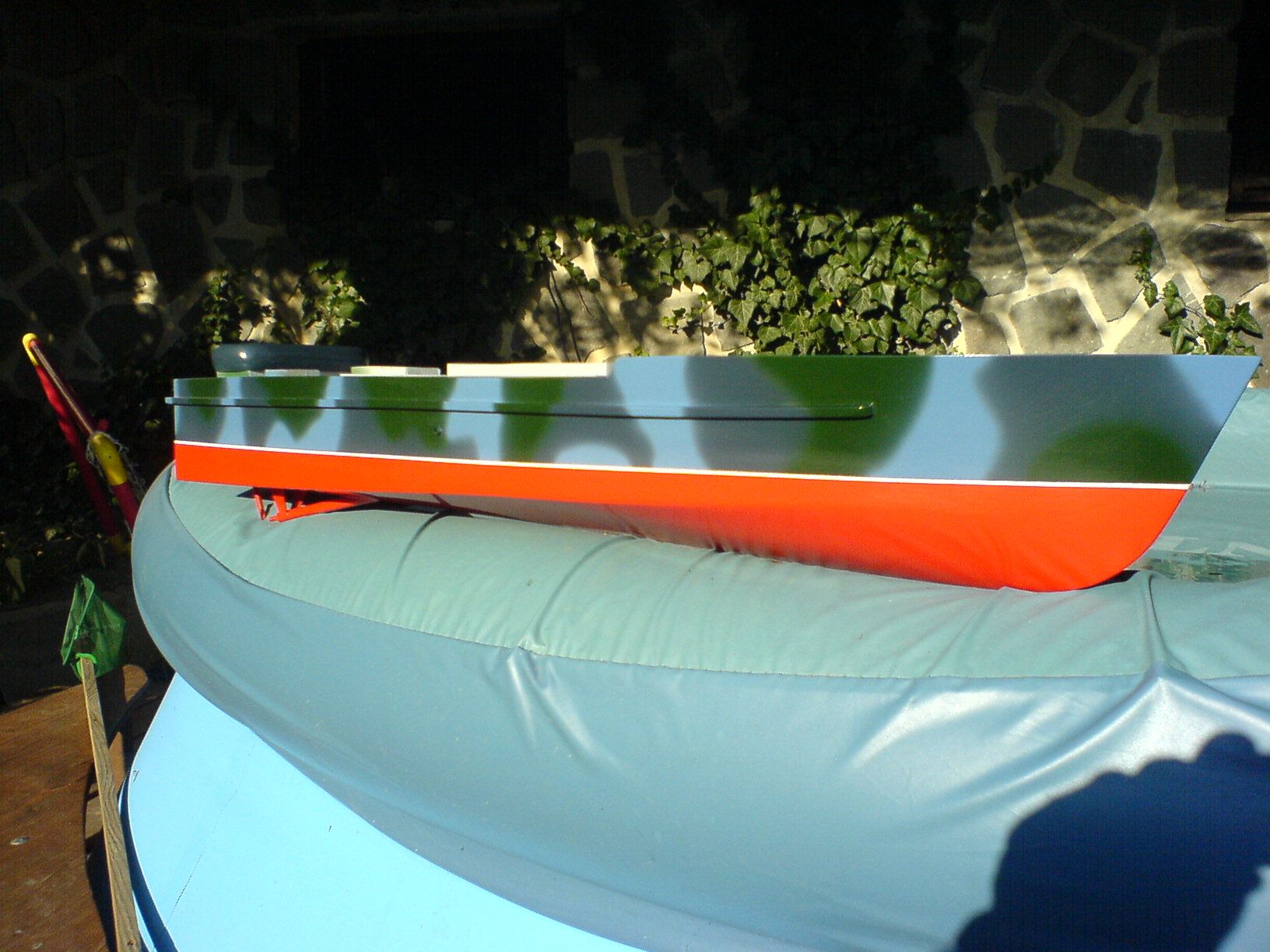 Vodní chlazení je samozřejmé, vytékající voda je efektní. Uvnitř trupu je uděláno místo pro Pb aku na dvou místech. Mám rád dlouhou jízdu bez nabíjení. V návodu jsou dvě možnosti provedení paluby. Rozhodl jsem se pro kompromis. Udělal jsem výřez větší než nástavba a osazení drážkou ze silikonové hadičky.(foto 7) Trup je laminován dvakrát stodvacítkou tkaninou. Nasávání jsem udělal tak, aby navazovala na kormidla.(foto8) Konečně nastal ten okamžik a po základovce se začalo uvažovat o povrchové úpravě. Jednobarevná úprava byla zavrhnuta. Hodně barev! Takto to začalo, čmáráním airbraschovou pistolkou!(foto9) Barvy jsou použity dvousložkové odstíny podle RAL. Je to moje první použití této technologie. Komresor Calex lednička. No a toto je výsledek.(foto11) Tak a nyní udělat pár detailů. Začal jsem člunem a výfuky. Člun je vybroušen z balzy, dno překližka. Rohož je udělána z lišt 2x5mm. Výfuky musí být samozřejmě dva. Mosaz a měď, celé pájeno.(foto13) V návodu není žádné zábradlí ale, když už jsem v tom pájení…. Materiál Cu 1,5mm a 2.5mm.(foto14)