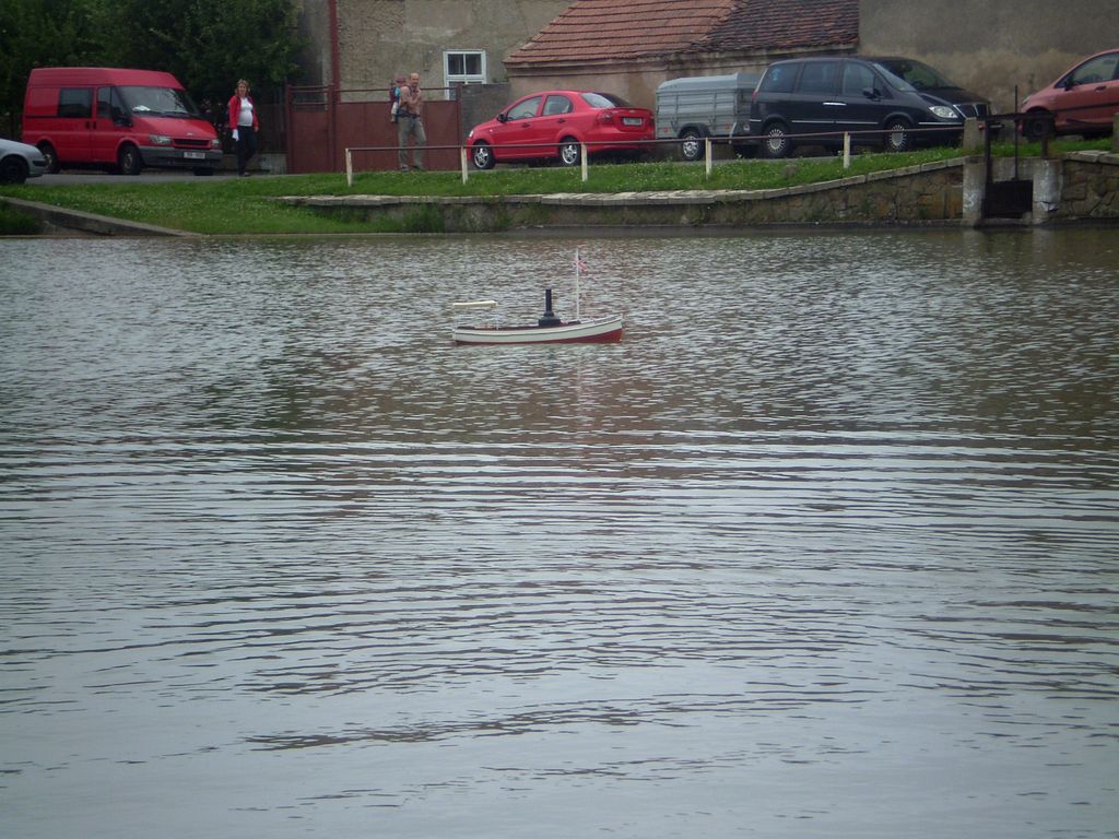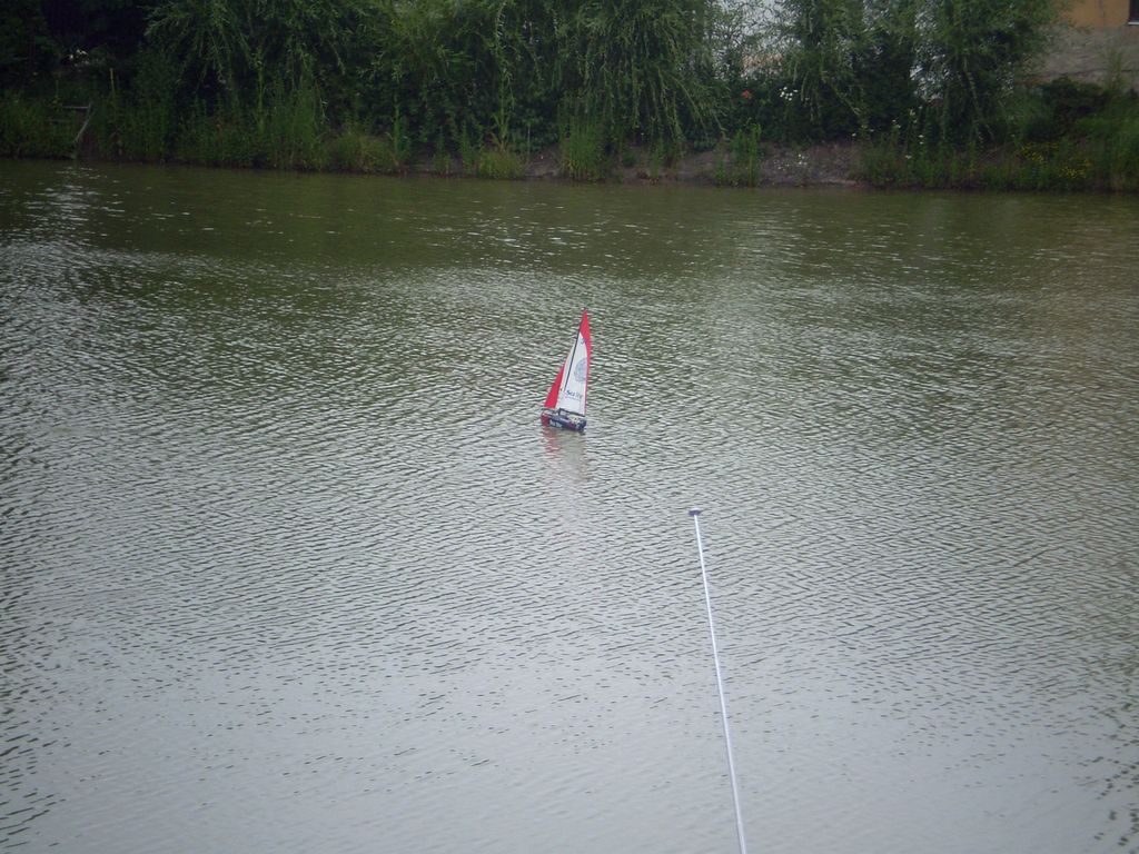 Po příjezdu na místo konání, Židovký rybník, se počasí „umoudřilo“, tzn. přestalo chcát a začalo pršet. Navzdory všemu kolem rybníka postávalo pár lidí, očekávajících, co se bude dít a pár „šílenců“ s lodními modely. Po počátečním rozpačitém chození kolem rybníka padlo rozhodnutí, že dáme alespoň nějaké modely na vodu. Jirka vytáhl svou plachetničku, já svou Sea Lite, vysílač sem vrazil do ruky staršímu synovi a už to svištělo. Vítr byl sice občas v nárazech moc prudký, ale jinak byl na plachetnice na hladině pěkný pohled. Jen je škoda, že byly jen dvě.
