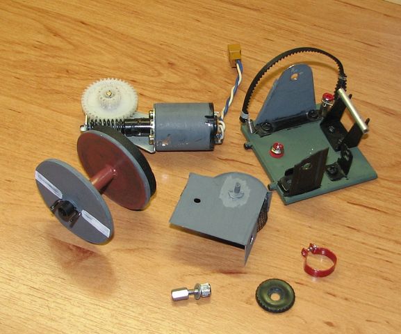 Po důkladné inspekcil všech zásob materiálu v loděnici, včetně toho, který měl být už dávno vyhozen, bylo nalezeno několik „klenotů“ a ty splynuly v jeden fukční celek. Plastová přepážka z kancelářskéhu šuplíku, plech a šroubky z PC case, motor, řemenička a převody z videa, k tomu nějaká ta výstražná tabulka a kousek depronu a to vše korunováno černou plastovou trubičkou, která byla u nových střevíců.