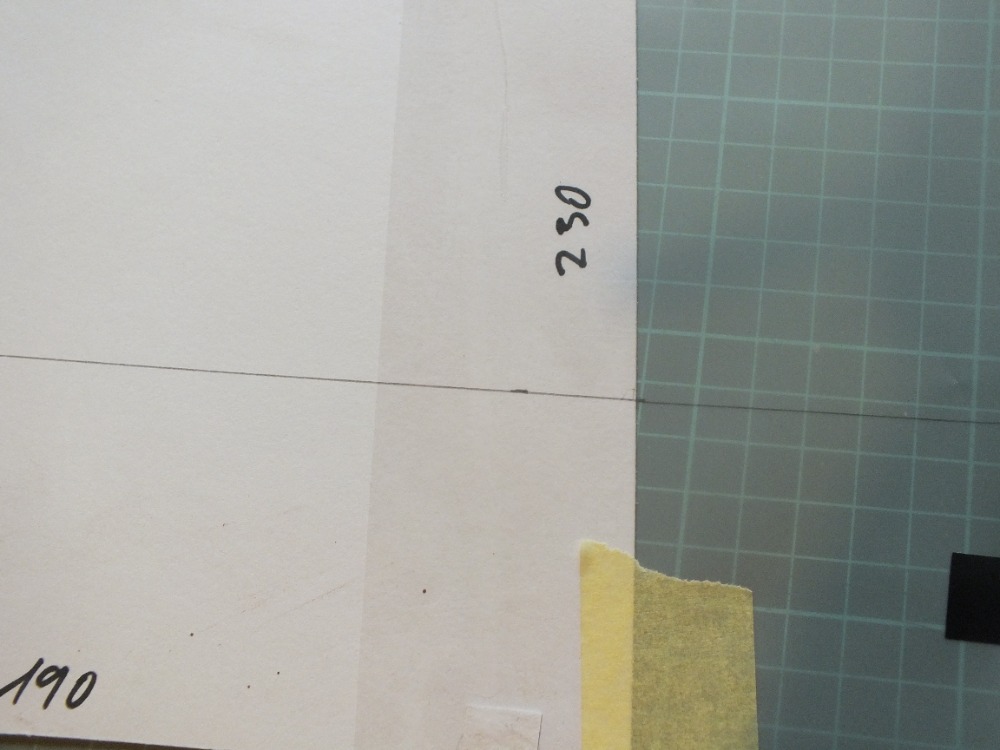 - Tak pokračuji dál. Po slepení všech dílů přiložím šablonu a připasuji ji podle lepených dílů a vrcholů profilu, zafixuji šablonu páskou a oříznu, kromě vrchu (obr. 13 až 17).