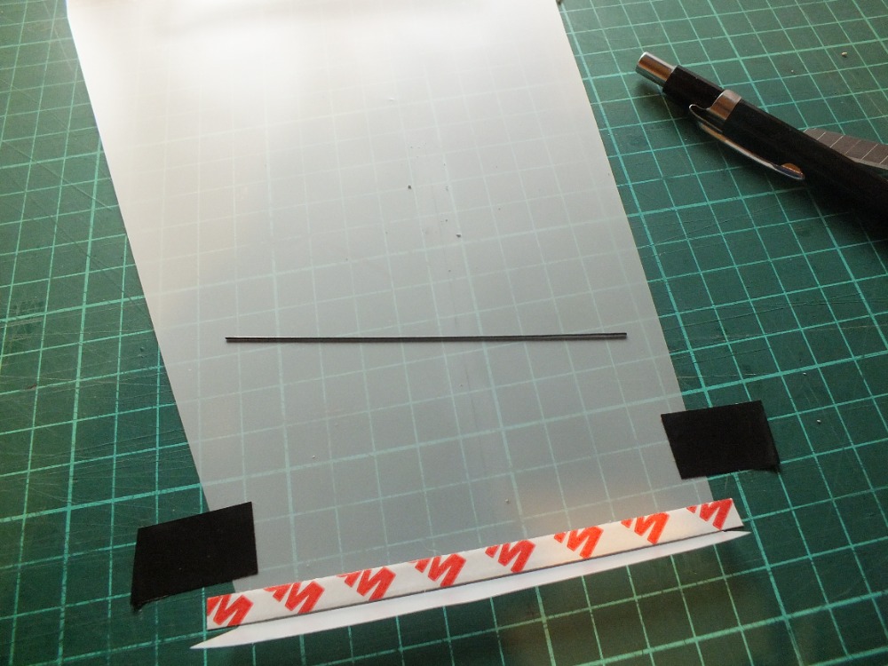 - Na vrch přilepím 3M pásku, ohnu zbytek mylaru, označím a oříznu na míru. Do ohybu dám 0,6mm uhlíkovou tyčku a zalepím (obr. 18 až 21).