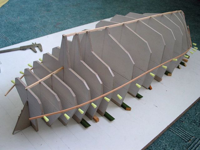 lamino-dřevotřískovou desku. Na tu jsem rozkreslil rozložení žeber. Nejprve jsem jednotlivá žebra přilepil k desce disperzním lepidlem,