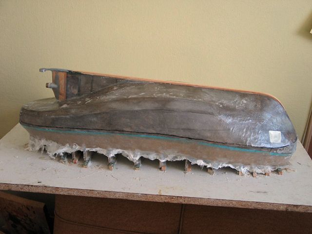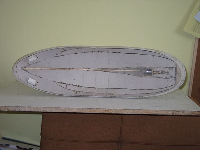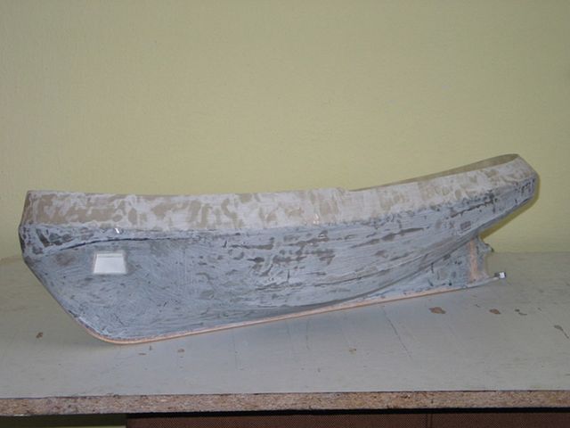 V tomto stádiu jsem k trupu přilepil boční kýl a olaminoval. Po vytvrzení obrousil a celý trup vytmelil
