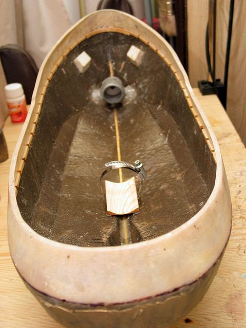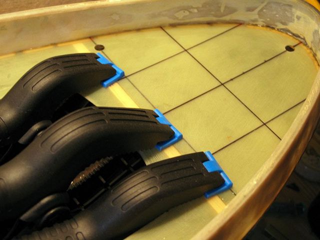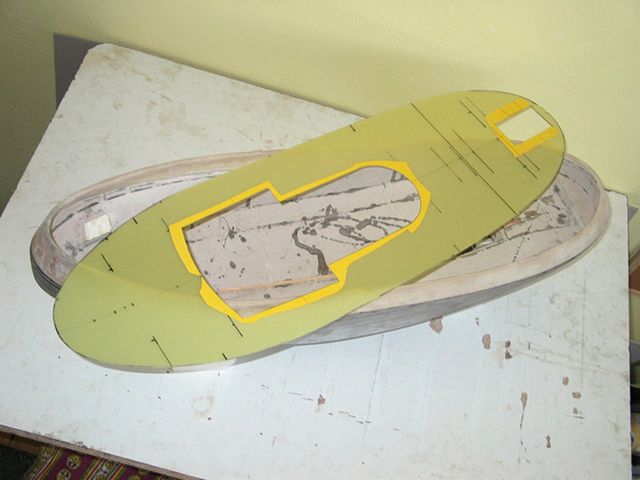 pomůcku uvedenou na fotce. Trup se položí dnem vzhůru a zajistí - vyrovná, na pomůcce nastavíme tužku o sílu stěny laminátu