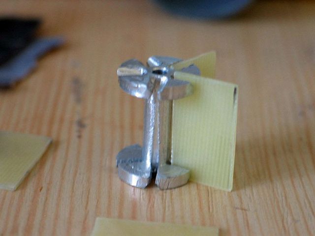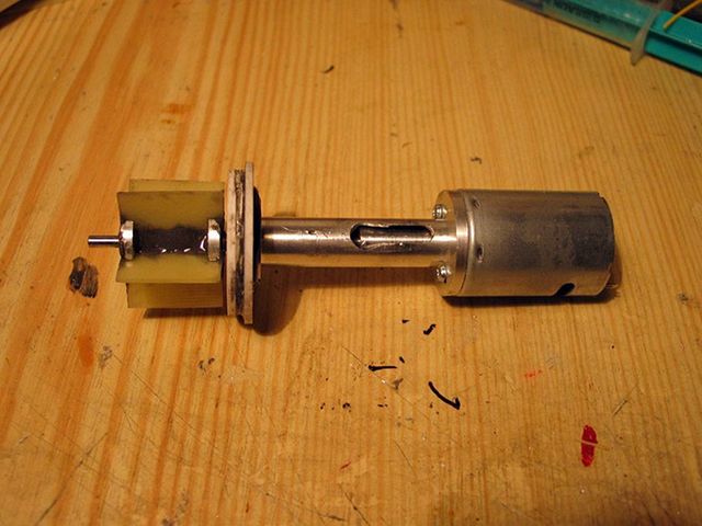 kterého jsem zhotovil závit a umístil červíka (zajišťuje lopatky na ose). Do špulky jsem vlepit 5 lopatek o rozměru
