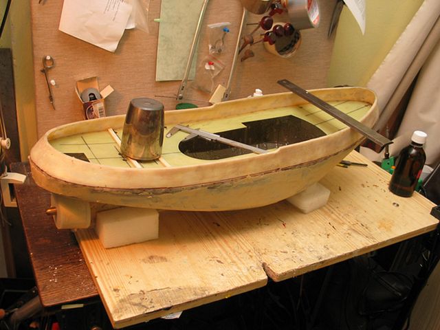 pojistil epoxydem zevnitř po obvodu. Pro zpevnění paluby jsem vlepil nosníky a v místě, kde budou úvazníky pak