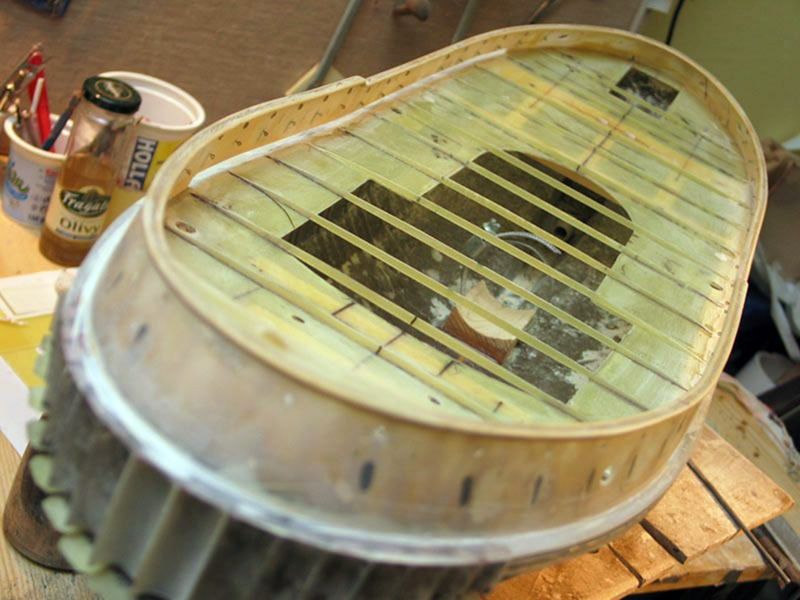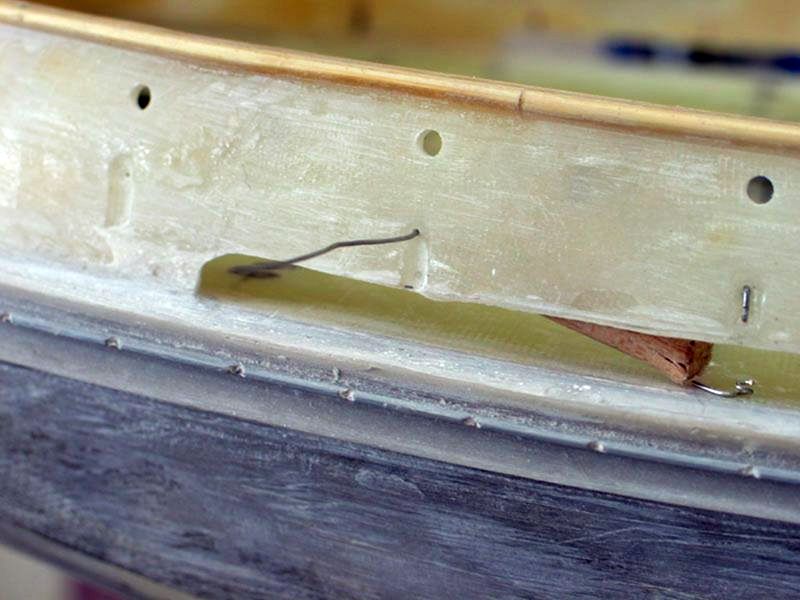 bortu. Použil jsem bambusové špejle z rolet. Pomocí přípravku jsem je obrousil tak, abych dostal nosník o půlkulatém profilu. Ten jsem pak nalepil okolo bortu. Probrousil jsem otvory