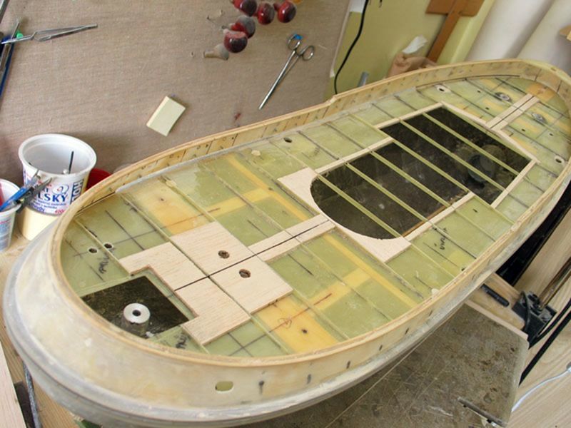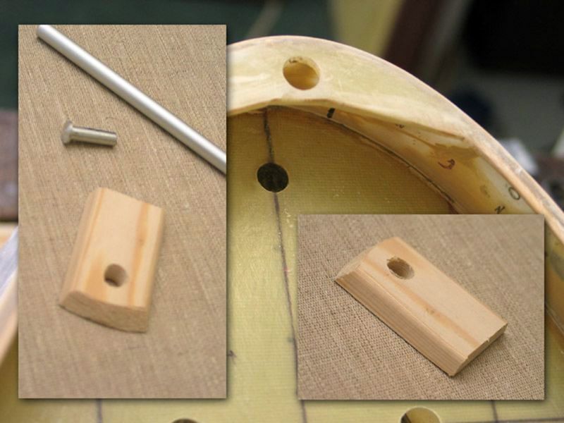 otvory jsem měl naznačené, rozšířil jsem je tak, aby trubičky přesně pasovaly. Zevnitř trupu jsem vlepil k palubě dřevěné destičky pomocí 24 h. epoxydu. Proti posunutí byli zajištěny vruty,