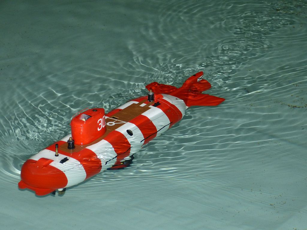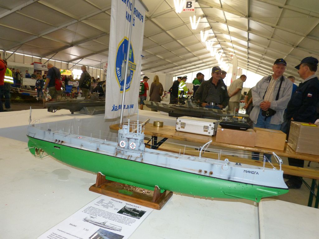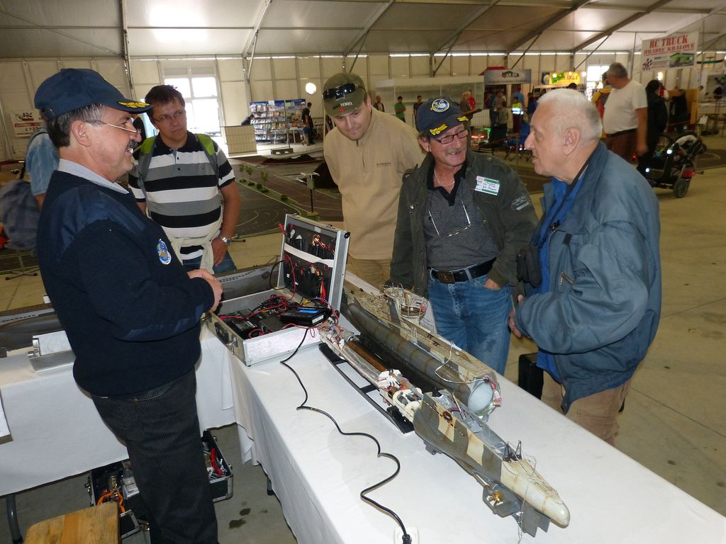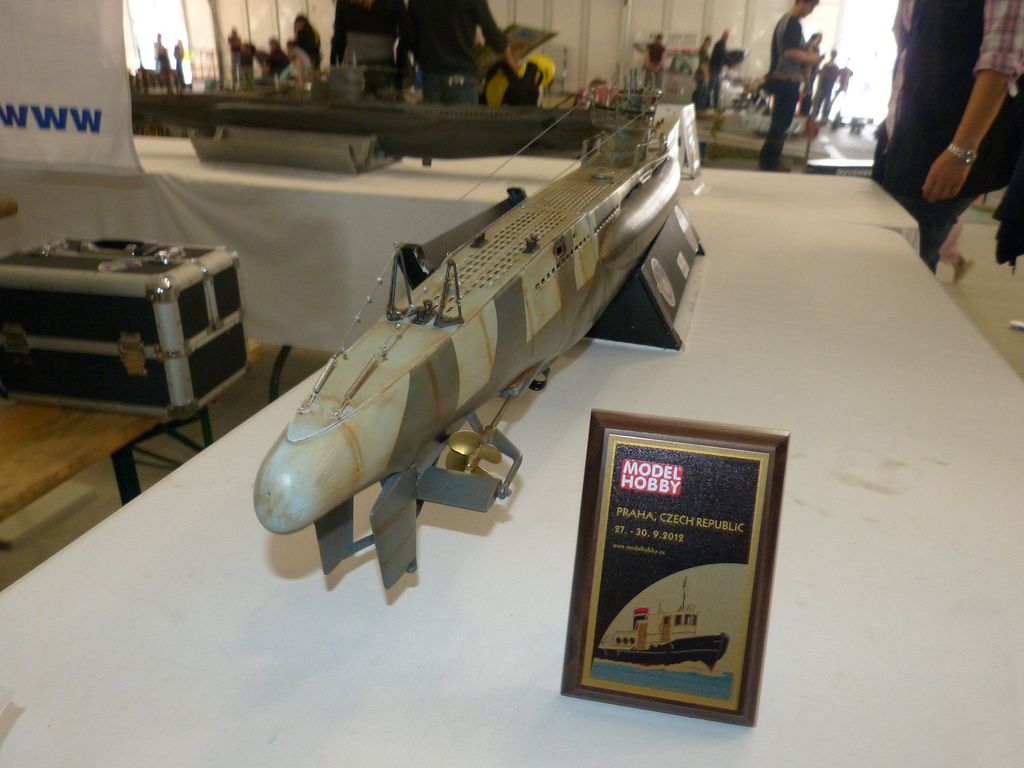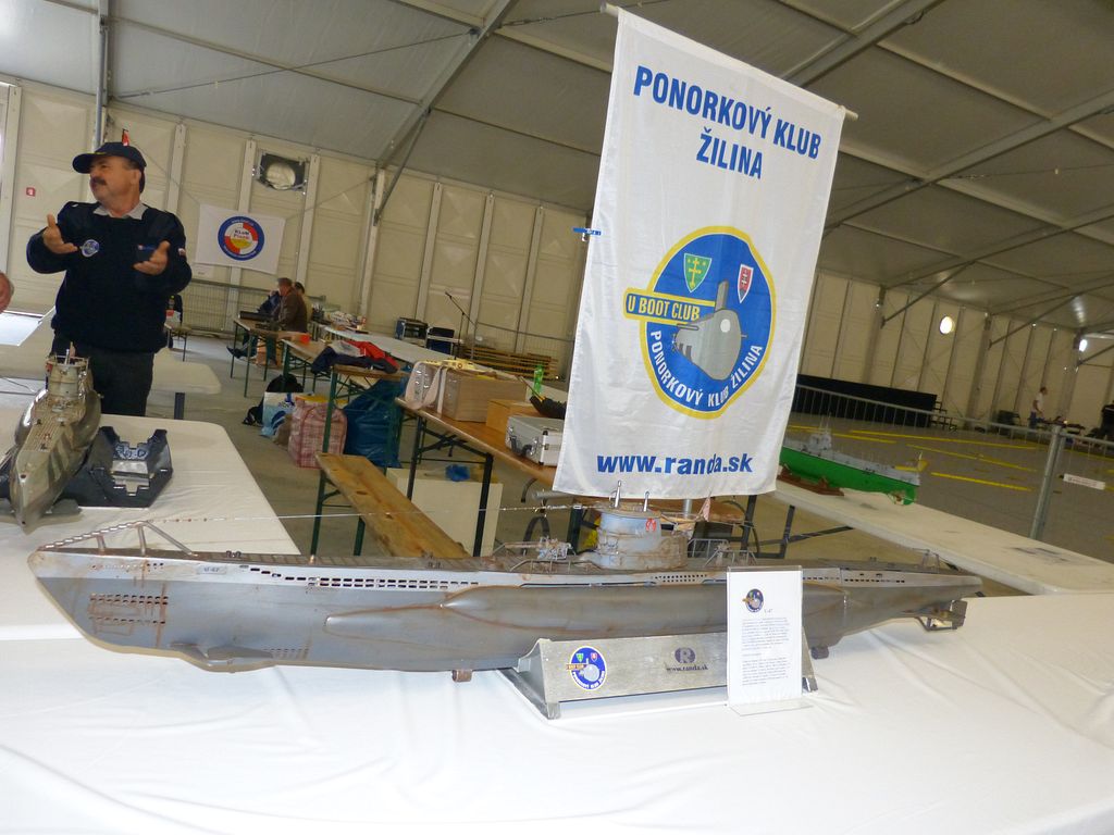 Naštěstí k bazénu dorazili alespoň ti, jež není nutné dlouho přemlouvat. Vedle Jirky Chaloupky, který přebíhal na E-day 2012, to byl český ponorkář Petr Jašek (KLoM Nautilus Proboštov) s modely Minoga a PRIZ a Vladimír Randa (predseda) z Ponorkového klubu Žilina se stroji U-47 a U-77. Jelikož jsem věděl, že nikdo jiný po celou dobu veletrhu přítomný nebude, přenechal jsem jim čelo výstavních stolů, aby byli první na ráně, až někdo z diváků zavítá k bazénu. Ukázalo se to jako dobrá volba.