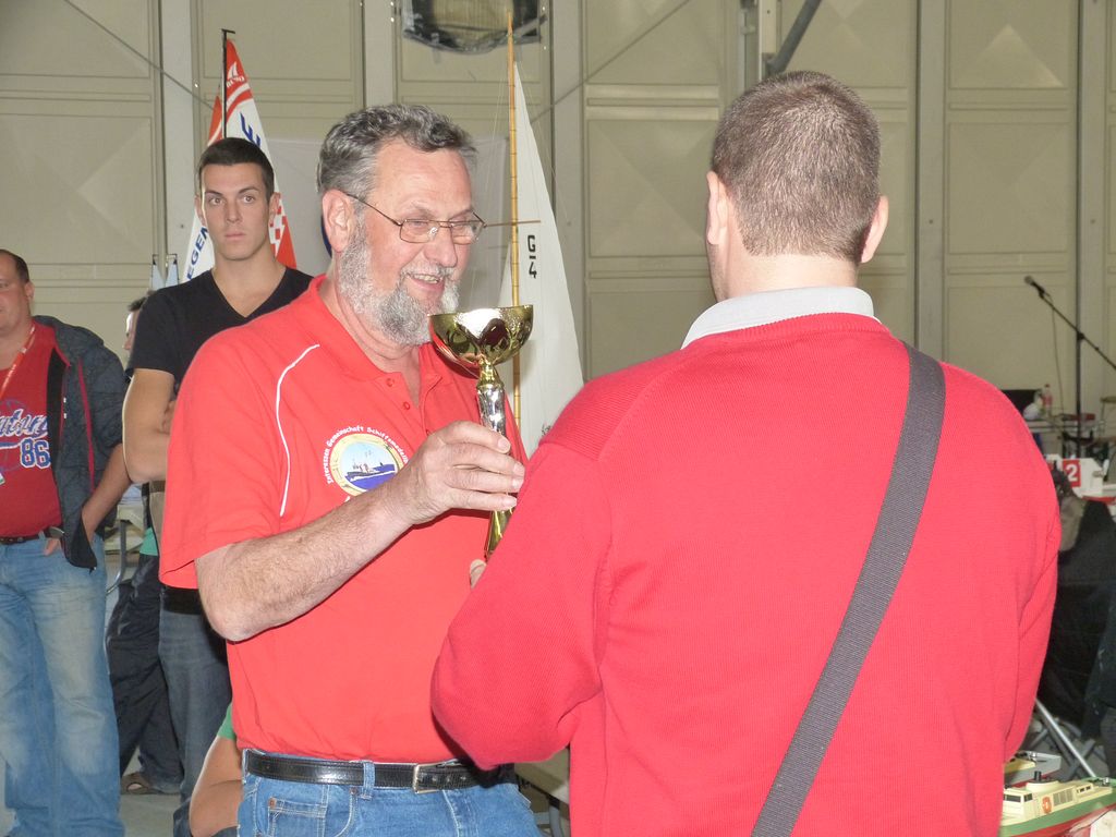 Model roku 2012. To se vyhlašovalo přímo u bazénu v průběhu nedělního odpoledne, přičemž jsme ho málem prošvihli, jelikož nás nikdo neinformoval. Z dalších lodních modelářů byl oceněn jen německý kolega Siegfried Borchert za SK-64 Bretling. Bez ohledu na modelářské odvětví bylo letos oceněno méně modelářů než v minulém roce a nic na tom nezmění ani skutečnost, že jsem pro všechny české lodní modeláře dohromady dostal jednu plaketu na památku.
