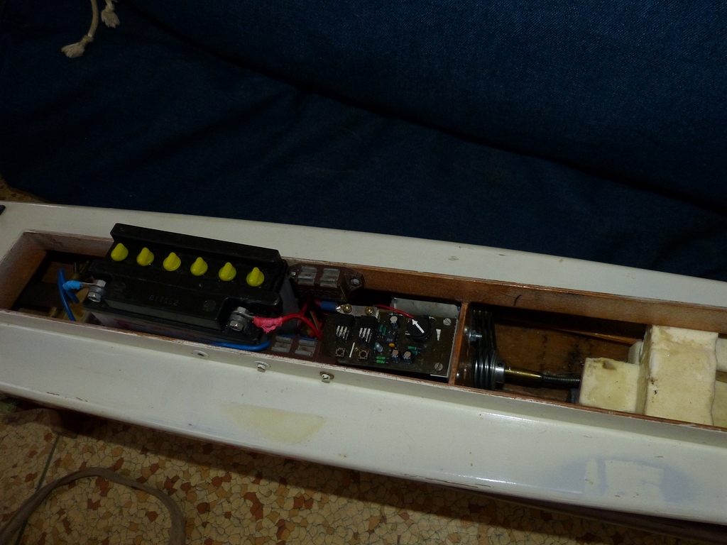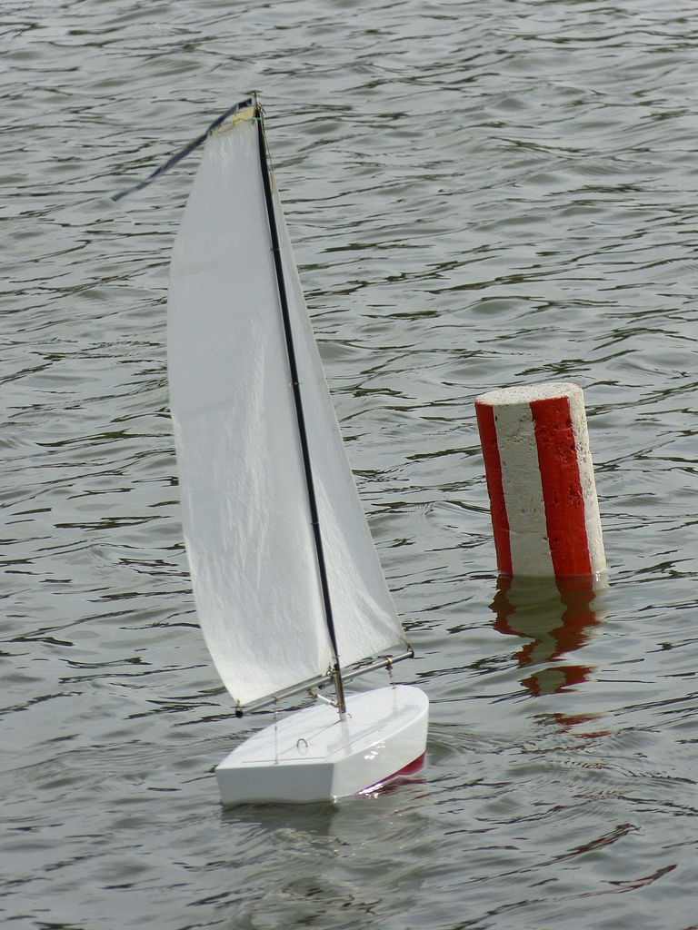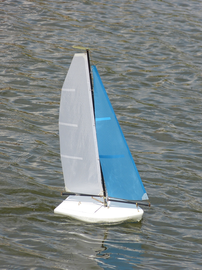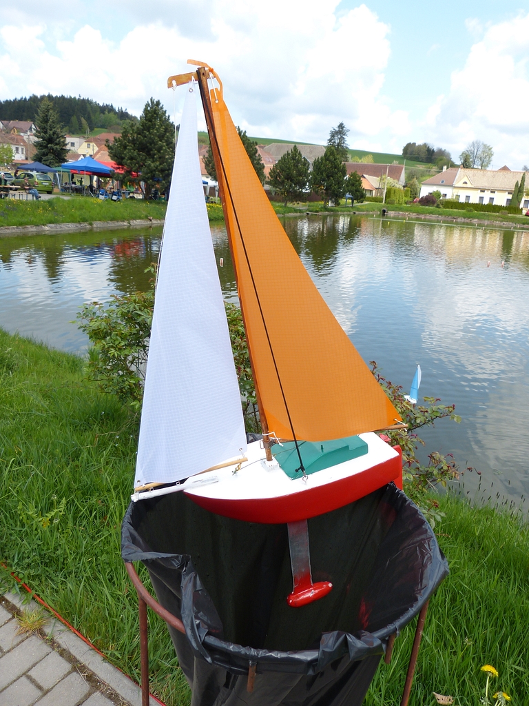 Ale abych jen nekritizoval jiné, vystřelím též do vlastních řad. Footynu, jejíž torzo od MB/RomanaT jsem narychlo doplnil plachtami pár dnů před soutěží, jsem jen krátce zkusil na bazénu, zda vůbec plave, a samotnou testovací plavbu z nedostatku času ponechal až do Sedlejova. Krátce před startem mi bylo jasné, že se úspěch nedostaví - neurazila proti větru ani píď. Po třech pokusech, kdy jsem plachetničku potupně zachraňoval na mělčině, jsem to vzdal a nadále se věnoval jen činnosti rozhodčího.