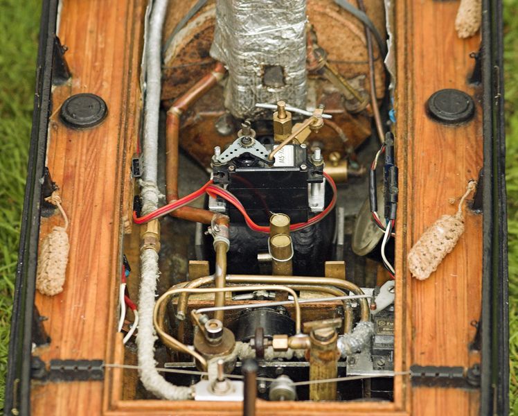 Ale zpátky k Phoenixu. Je plavbyschopný. Fotografie ukazuje stroj po GO. Desítky hodin plavby se podepsaly. Válce a písty oscilačního stroje se vyběhaly do oválu a byly vyměněny, doplněno kondenzační maznicí. Kotel dostal nový silnější plášť a je již pájen stříbrem. Už tuto technologii ovládám. Hořák je osvědčený Cheddar, tj. keramický. Všechny předchozí ptákoviny (redukční ventily, vzduchové ventilátory, předehřívání plynu) což bylo dost náročné, šly do penze. Nakonec jsem vyrobil vlastní nádržku na PB svařenou z oceli. Už nemusím při její výměně vyndávat stroj. Její objem je dostatečný. Hořák se dá ovládat servem pomocí RC. Je to patrné. Protže kotel nemá automatickou regulaci, je to potřeba. Vzhledem k setrvačností kotle (velký objem vody) se to dá ručně uregulovat. Jezdím s ní už jen propagační jízdy. Hradec Králové - nábřeží paromilů a Vyžlovka zahájení sezony.
