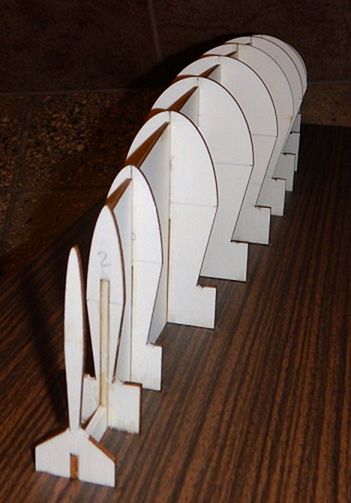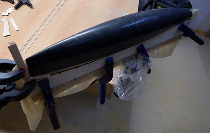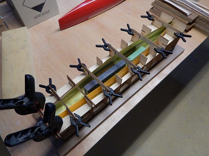 . Je to daň snaze docílit co nejnižší váhu, náš trup má necelých 60 g. Musíme tedy řešit dříve neznámý problém, jak zajistit osazení trupu dalšími prvky bez zdeformování jeho tvaru. Spoléhat na genialitu a slepení všeho od oka v ruce nechceme, tak Honza usedá k PC a s využitím dat trupu kreslí dělenou vnější konstrukci. Do takto vytvořené vnější konstrukce laminátovou skořepinu musíme přesně ustavit, k tomu využíváme hrany trupu, pro kontrolu i průběh hrany mezi boky a dnem. Jde o poměrně zdlouhavou práci, při které si pomáháme pomocnými příčníky a také vnitřními žebry. Jakmile jsme spokojeni s ustavením trupu, tak lepíme na boky balzové pomocné lišty, na jejichž horní hranu přijde přilepit paluba. Ve vnitřních žebrech jsou vyříznuté dorazy a tak postupně na oba boky lišty přilepíme. Také vlepíme na svoje místo balzové příďové a záďové žebro. Po dokončení trupu bude záď šikmo seříznutá podobně jako na předchozích typech.
