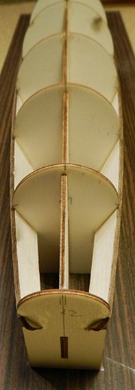 V trupu je místa „jako v hodinkách”, tak před lepením paluby musíme vložit desku serva kormidla a celý středový prvek. Potom stále ve vnější konstrukci budeme lepit palubu. Zmíněná vnější konstrukce je připravená tak, že umožňuje vložení kýlu do pouzdra a také stěžně (uhlíkové trubky). To vše opět pro kontrolu správného ustavení. Paluba je z plastu tl. 1 mm. Po zalepení paluby demontujeme vnější konstrukci, trup již je dostatečně tuhý.