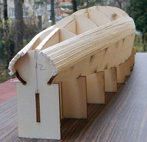 Po slepení konstrukce z březové překližky tl. 3 mm došlo na obšívku z 3mm balzy. Nejprve boky z plátů balzy, která šla překroutit do tvaru i bez namáčení.