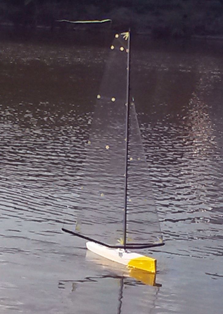 V ráhnech jsou průchodky pro upevnění plachty a její trimování, ty vypouzdřuji plastovým vnitřkem lanovodu – postačuje vyvrtat otvor, zalepit vteřinovým lepidlem a zaříznout s ráhnem. Pomocné ráhno kosatky je vpředu upevněné kyvně tak, aby ráhno mohlo volně vést kosatku do vyložení vůči přednímu ráhnu. Na konci ráhna kosatky ještě posléze přibude netradičně řešený „kiking”, kde je konec ráhna připevněn na uhlíkovou kulatinu délky 300 mm a průměru cca 1 mm, jehož druhý konec je zasazen do stěžně a definuje dráhu pohybu konce ráhna kosatky. Do trubky stěžně postačuje vyvrtat otvor průměru 0,5 mm a na horní konec tyčoviny připevnit drát průměru 0,4 mm se „Z” ohybem, který zasadíme do otvoru ve stěžni. Spodní konec potom zalepíme do pomocného ráhna. Horní úchyt kosatky je vyroben z laminátové trubky a páskoviny. Veškeré napínací a uvazovací prvky jsou z rybářské šňůry Dyneema. Jako seřizovací a napínací prvky slouží nastříhané pásky PVC hadiček, navlečené na ráhna.