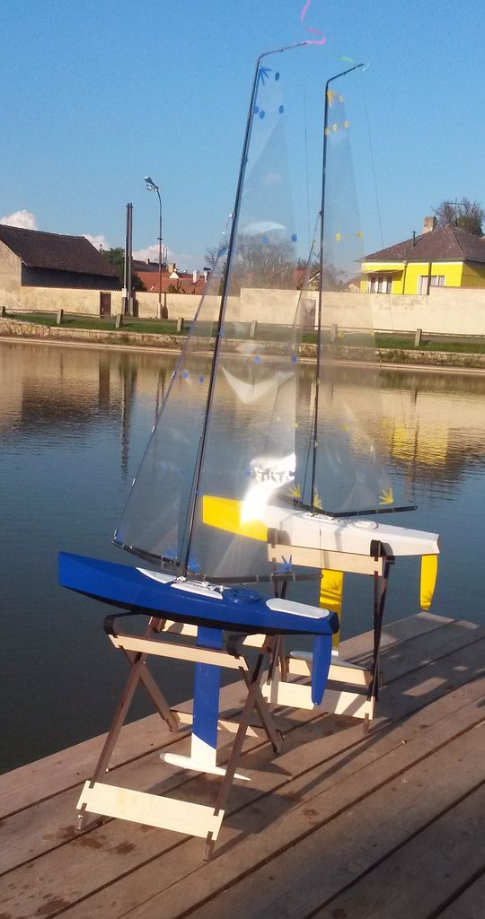 Nastavíme mírné napětí v předních lemech obou plachet, vydutí profilu a vyložení pomocného ráhna kosatky, které určuje velikost štěrbiny mezi plachtami. Od oka nastavíme twist (přetočení) plachet a výsledek si zkontrolujeme mávnutím oplachtěním, které držíme za spodek stěžně. Plachty by měly být naplněné, hladké a bez záhybů a vrásek. Lepší trim oplachtění nastavíme až při ježdění. Někdo používá i na modelu špionky ukazující proudnice vzduchu z bavlnky, pásky z kazety a jiných lehkých materiálů. Jde to ale i podle oka a zkušeností![]()
