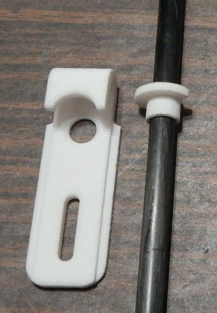Vlastní stěžeň je složený z uhlíkové trubky 6/5 mm, nahoře je trubka 5/4 mm a výložník (crane) je vylaminovaný z uhlíkového provazce do zvoleného tvaru a vsazený do horní trubky. Crane můžeme vyrobit tak, že do hadičky zatáhneme uhlíkový provazec přehnutý na polovinu a prosycený pryskyřicí, hadičku v jednoduché „formě” tvarujeme do žádaného tvaru. Po vytvrzení hadičku podélně rozřízneme a máme tvarový kus. Trubky jsou v místě vsazení dalšího prvku zpevněny omotáním šňůrou Dyneema, prosycenou vteřinovým lepidlem.