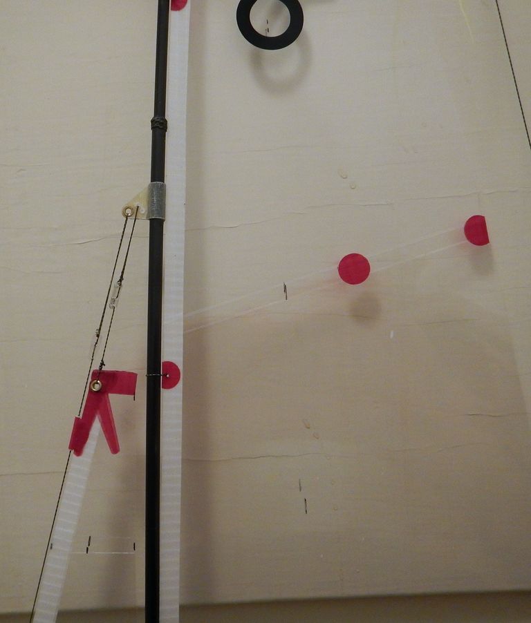 Lanko otěže je zakončeno karabinkou, tu protáhneme oválným očkem na spodku ráhna a zahákneme do očka. Konstrukce umožňuje doladění pozice těžiště oplachtění – po povolení inbusového šroubu lze posunutím segmentu „kývat” se stěžněm vpřed a vzad a tím ovlivnit návětrnost nebo závětrnost lodi. Uváděným cílem je neutrální chování lodi, kdy model ve větru drží směr jízdy bez korekce kormidlem. Současně se doporučuje mírný záklon stěžně, a to cca 2°.