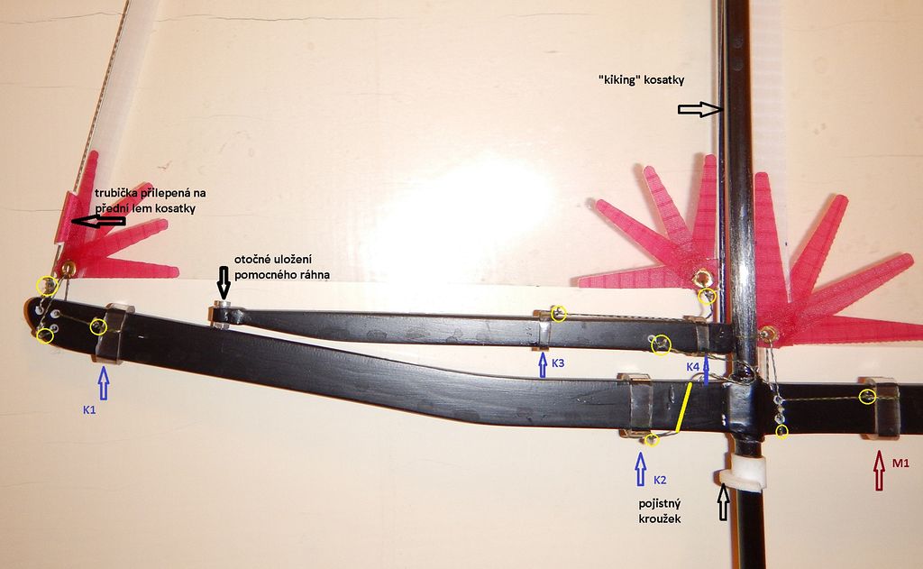 Pokud jste zaznamenali větší počet průchodů úvazků ráhny, tak je to pro zajištění následujících funkcí. Spodní přední oko kosatky i mainu je napínáno stejným systémem tak, abychom zmenšili potřebnou přídržnou sílu. Proto je úvazek napevno připevněn k ráhnu, využijeme spodní průchodku a zavážeme okolo ráhna. Potom úvazek prochází dutým nýtem a vrací se na druhé straně ráhna do horní průchodky a odtud pod kroužek K1 respektive M1, kde je připevněn. Při napínání doporučuji uchopit přední lem plachty do prstů a vyvinout potřebnou sílu k napnutí a následně kroužkem K1/M1 jen dotáhnout úvazek – méně namáháme konstrukci a máme lepší přehled o napětí v předním lemu. Pro snazší orientaci jsou na obrázcích ráhna žlutým kroužkem zvýrazněny uzly na úvazcích.