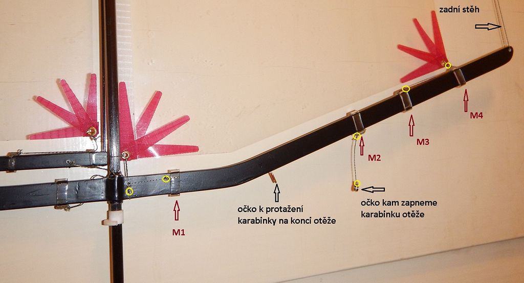 Doladění délky otěže – po nastavení sklonu oplachtění doporučuji opatrně „přitáhnout” a podle aktuální délky otěže povolit/přitáhnout otěž posunutím plastového kroužku M2 po ráhnu tak, aby ráhno bylo v pozici „plně přitaženo”. Jde o jednodušší postup, než měnit výchylku serva plachet – to je naprogramováno na maximální výchylku 176° a je třeba pamatovat na mechanický rozsah pohybu páky v lodi a na možné poškození serva!
