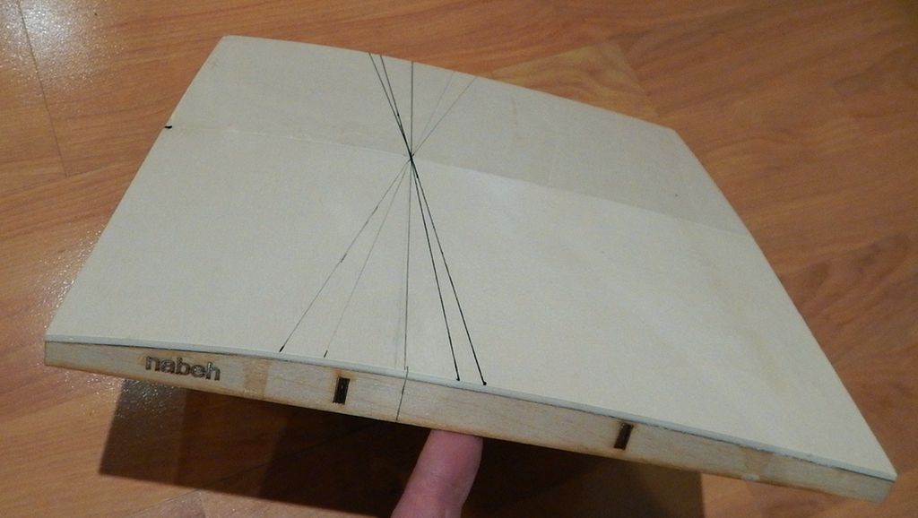 Jakmile máme připravené všechny díly s nalepenou páskou, můžeme přikročit k lepení. Já používám přípravek „želva”, vyrobený z překližky. Zde máme možnost volit různý profil plachty a sklon segmentů, možností je opravdu hodně. Sousední díly plachty si ustavíme na přípravek tak, aby značky vrcholu profilu byly ve správném místě a aby odpovídala pozice spoje. Na obrázku je ilustrativní ukázka dvou dílů na přípravku, ale jedná se o papírové šablony, díly z průhledné folie jsou nevyfotitelné. Kraje dílů fixujeme například papírovou páskou k přípravku, díl bez lepicí pásky nadzvedneme, odstraníme krycí pásku z oboustranné lepenky a nadzvednutý díl opatrně vrátíme a kontrolujeme spoj. Pokud je vše v pořádku, tak spoj přitlačíme a stejným způsobem postupujeme s dalšími díly. Takto slepíme základní pláty plachet, které již mají patřičný profil. Podle půdorysného střihu si vyznačíme linie hran a přesahy na předním a zadním lemu ořízneme.