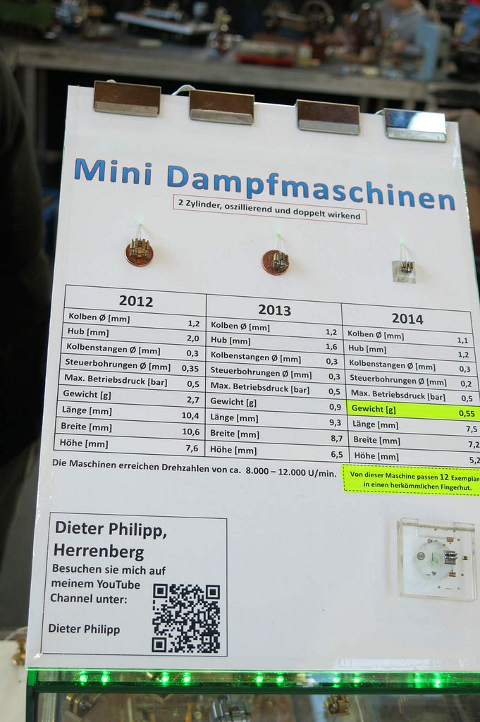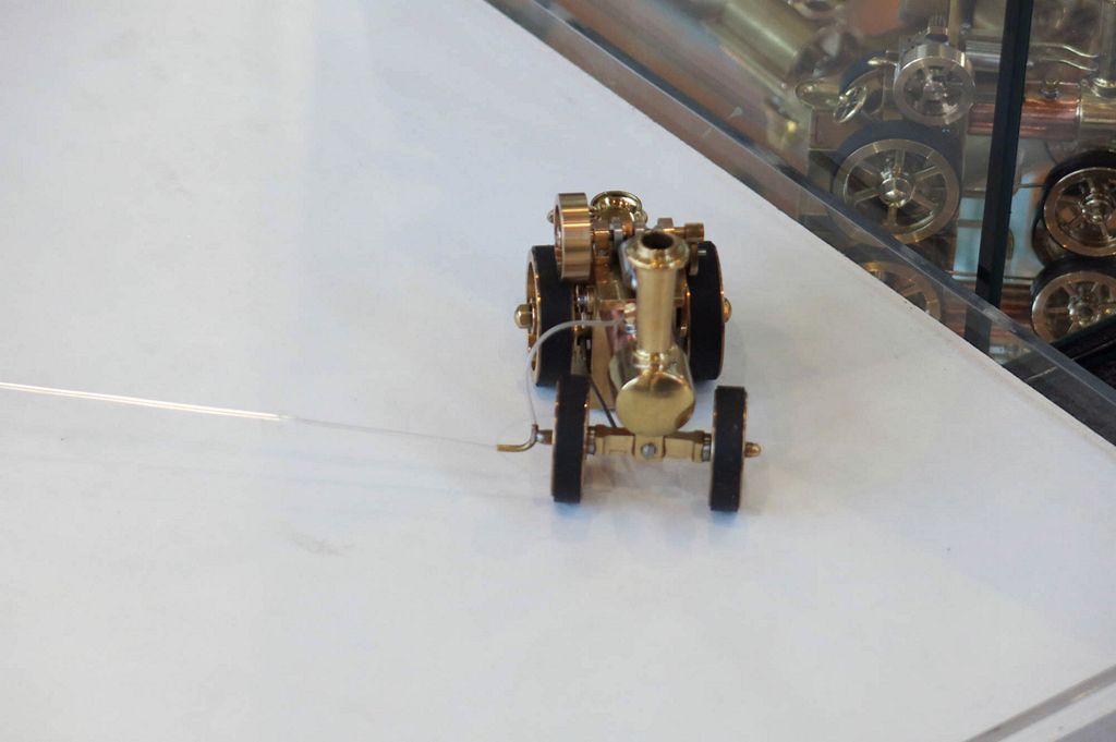 Medzi prvými exponátmi ma zaujal najmenší parný motorček. Dvojčinný oscilačný dvojválec s vŕtaním 1,1 mm a zdvihom 1,2 mm je neuveriteľné dielo. Vývoj v miniaturizácii je na ofotenej tabuľke. Väčší z týchto motorčekov bol v lokomobile, ktorá krúžila okolo kotlíka, s ktorým bola spojená s hadičkou. Dôvod - dlhšia prevádzka lokomobily bez prerušenia pri dopľňaní vody a liehu.