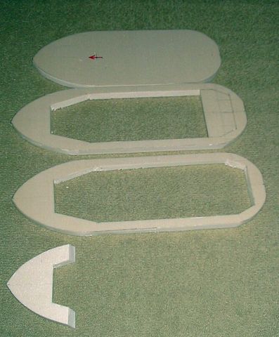 Z desky extrudovaného polystyrénu silného 2cm vyřežeme čtyři desky (1,2,3,4) ve tvaru lodního trupu.