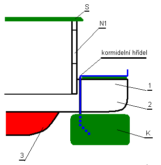 plastovou trubičku. Do trubičky zasuneme hřídel kormidla (K). Kormidlo (K) srovnáme do přímého směru a hřídel těsně nad