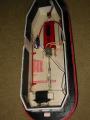 Model dáme na hladinu s vypnutým pohonem. Pomocí rybářských olůvek dovážíme trup tak, aby paluba byla vodorovná a lodní