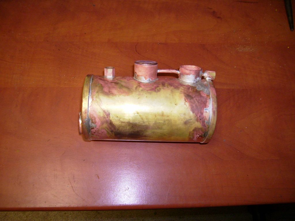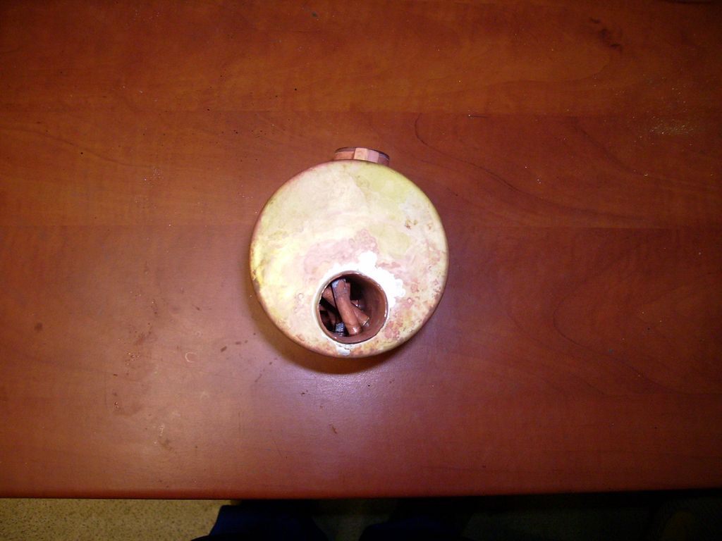 Přes noc jsem výrobek nechal macerovat v louhu na vápenec a ráno, pln nadšení, věc umyl, našrouboval fitinky a začal do plamencové trubky žíhat hořákem Meva 1200 W s úmyslem vyzkoušet, čeho je kotlík schopen.