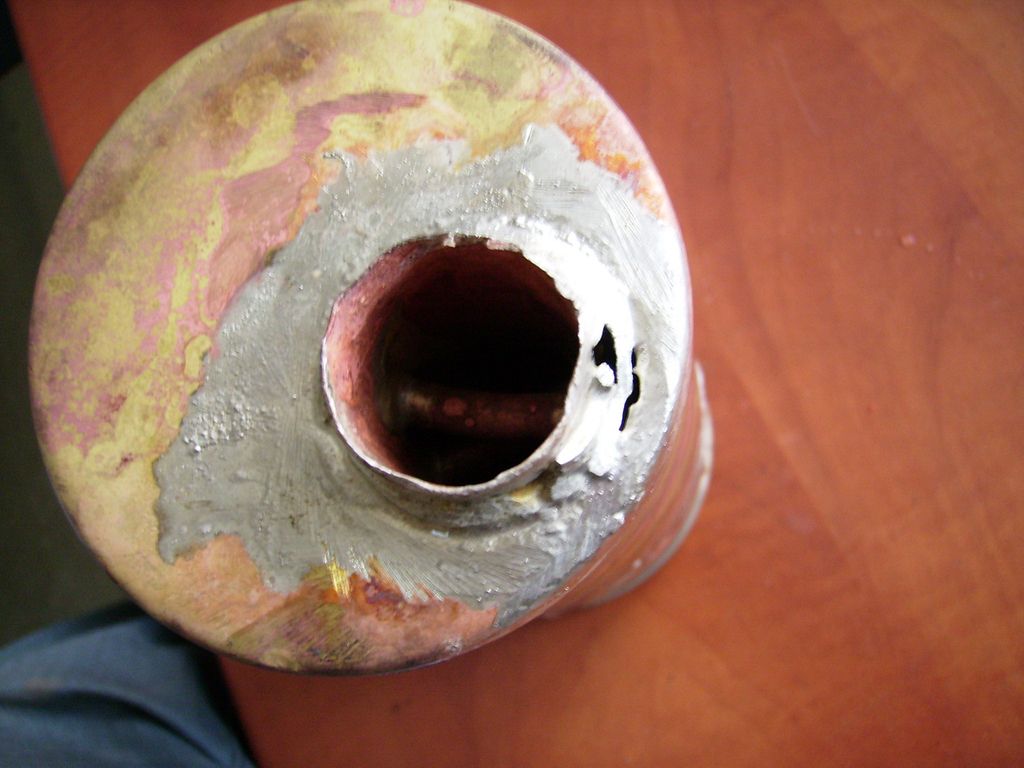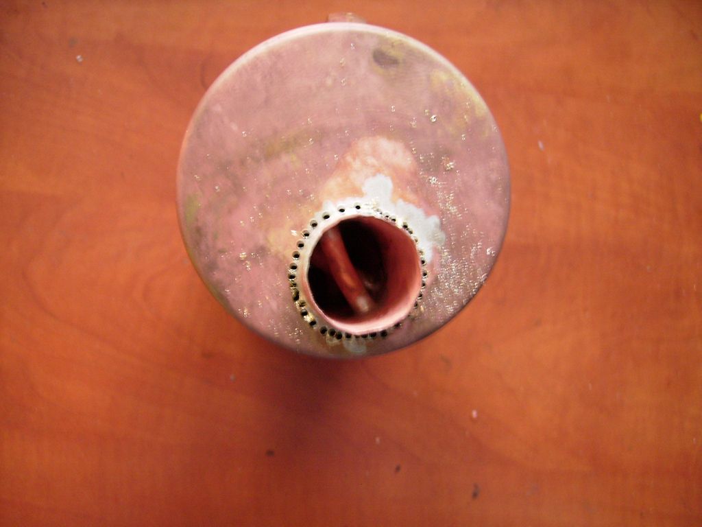 Odvrtat se to dalo už jen větším vrtákem, takže díra kolem plamence byla jako do stodoly a chvilku jsem si říkal, že to bude chtít novou přírubu, ale nakonec jsem vyrobil mezikruží a tím tu velkou díru uzavřel. Dokonce jsem musel přiložit mosazný drát 2mm průměru a celé to stříbrem převařil. To hlavní: Nakonec jsem vyrobil mosazné špunty a uzavřel jimi plamencovou trubku na obou koncích, spájel cínem a naplnil vodou - byla to práce jako na kostele -, a do ní začal dmýchat hořákem.