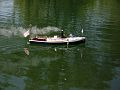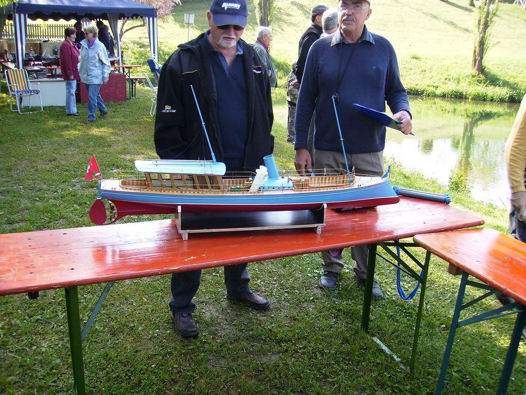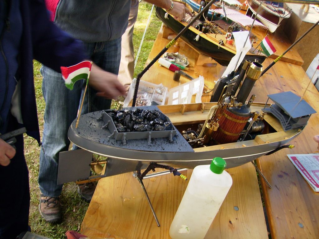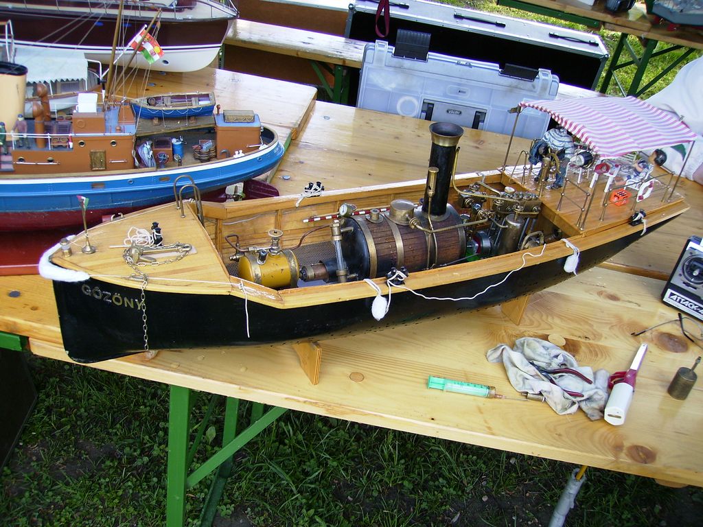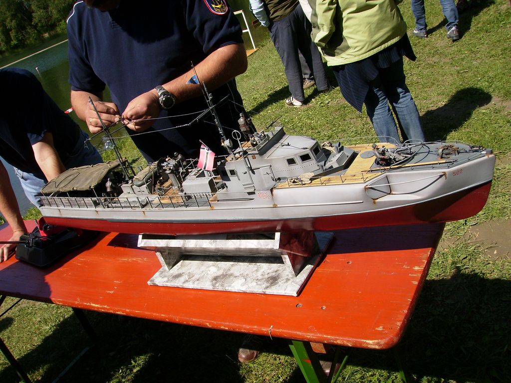 Houf lodí vyrazil zleva doprava. Každá má kolíčkem připnuté velké startovní číslo, aby tři soudci věděli, která uplavala kolik kol. Moje je druhá nejmenší. Trup vlečné lodi není to pravé ořechové, ale zase loď veze kotel asi 1,1 litru a to by mělo stačit i na tři čtvrtě hodiny. Samozřejmě jsem skoro nejpomalejší, ale loď krouží kolem dvou branek, jako by se nechumelilo půl hodiny, zatímco některé ostatní odpadávají. Kolem se po vnější straně pelotonu řítí Saddámova máma, nějaká rakouská torpédovka pana Michaela Fraumbauma s tříválcovým strojem, speciálem pro tento závod, který si Michael postavil podle vlastního návrhu. Na přírubách šoupátek má vyfrézováno velké F jako Fraumbaum. Je to hračička, a hlavně je to genius. Asi má v práci CNC mašiny, a tak udělal maximum.