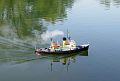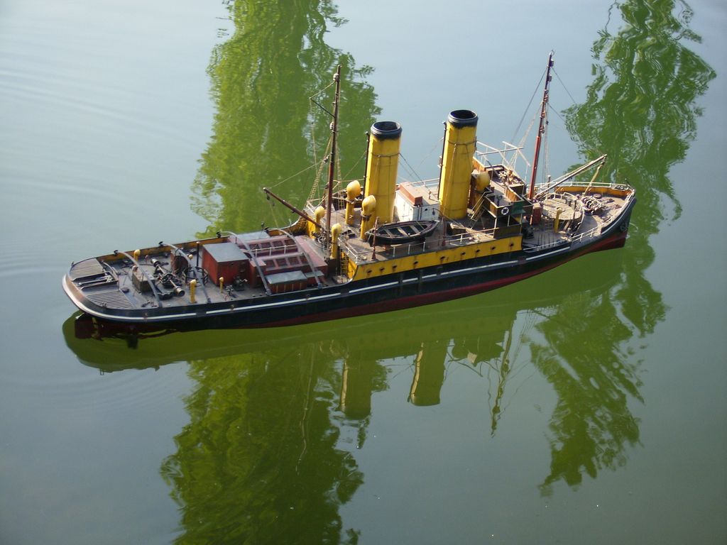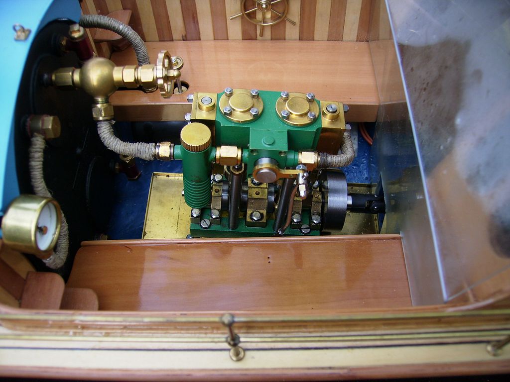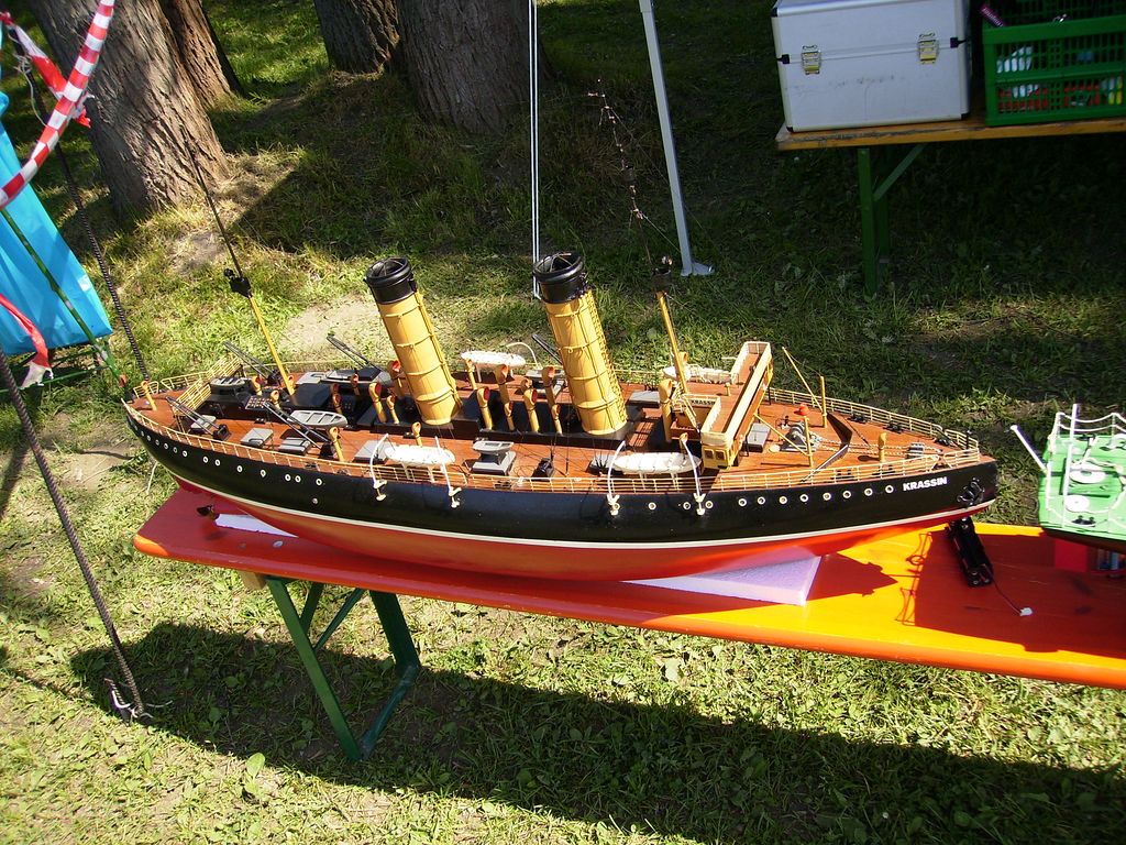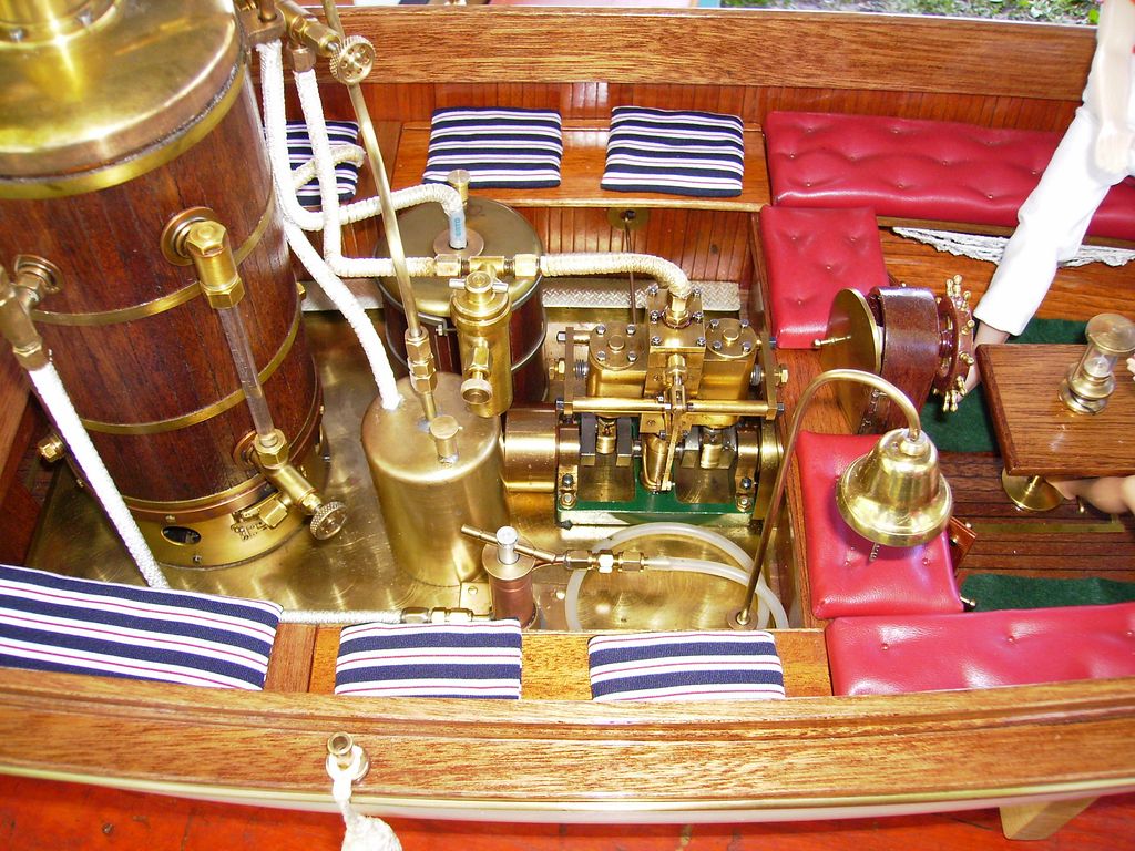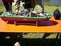 Houf lodí vyrazil zleva doprava. Každá má kolíčkem připnuté velké startovní číslo, aby tři soudci věděli, která uplavala kolik kol. Moje je druhá nejmenší. Trup vlečné lodi není to pravé ořechové, ale zase loď veze kotel asi 1,1 litru a to by mělo stačit i na tři čtvrtě hodiny. Samozřejmě jsem skoro nejpomalejší, ale loď krouží kolem dvou branek, jako by se nechumelilo půl hodiny, zatímco některé ostatní odpadávají. Kolem se po vnější straně pelotonu řítí Saddámova máma, nějaká rakouská torpédovka pana Michaela Fraumbauma s tříválcovým strojem, speciálem pro tento závod, který si Michael postavil podle vlastního návrhu. Na přírubách šoupátek má vyfrézováno velké F jako Fraumbaum. Je to hračička, a hlavně je to genius. Asi má v práci CNC mašiny, a tak udělal maximum.