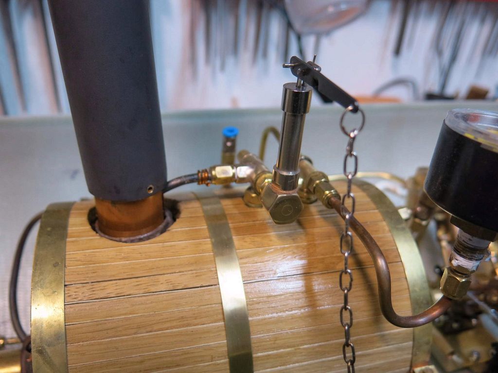 V prvom rade som sa začal venovať bezpečnosti plavby. V prípade, že ostane lodička v strede rybníka stáť, treba vypnúť plyn, aby neprehorel kotlík a nezhorela loď, ako Slaven. Tak som pod provu umiestnil uzatvárací ventil so servom. Plyn vstupuje do uzatváracieho ventila so servom, odtiaľ ide do regulačného ventila (udržuje rovnaký tlak na výstupe nezávisle od poklesu tlaku v plynojeme), z toho pokračuje do regulačného ventila, ktorý reguluje prietok plynu do horáka v závislosti od tlaku pary v kotli. Je nastavený tak, že pri tlaku 2 bar uškrtí plyn do horáka a pri poklese tlaku pary znovu otvorí plný prívod plynu.