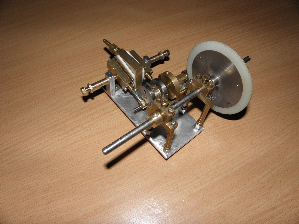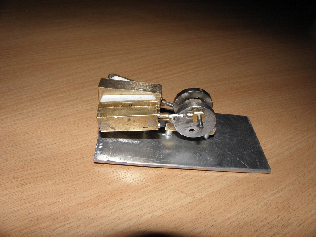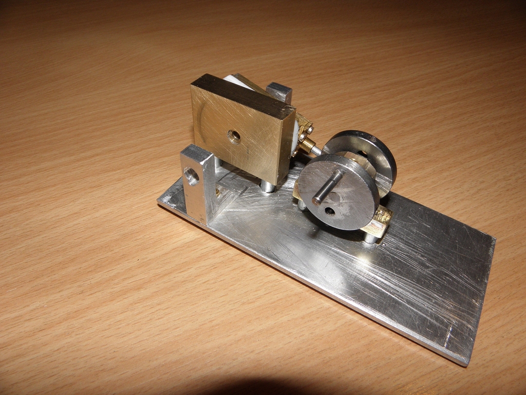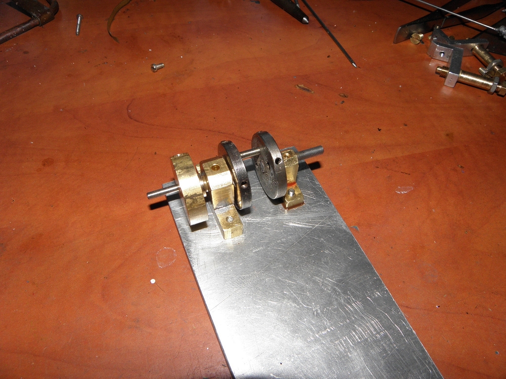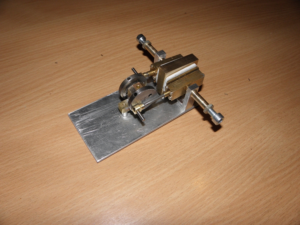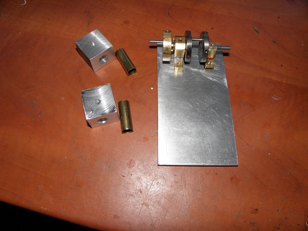 Obvyklou mojí metodou jsem vyrobil duralové hranolky, vyvrtal do nich díry, do nich zasunul a zalepil Ms hlazenou trubičku 10/9 mm délky 27 mm - obsah tohohle válce by měl být úměrný původním 8mm na 20mm a navíc jsem vyrobil malou klikovou hřídelku 4 mm se dvěma ložisky. Původní „klika“ byla jen náhražka 13 mm široká s excentry na obou koncích - to bylo špatné.