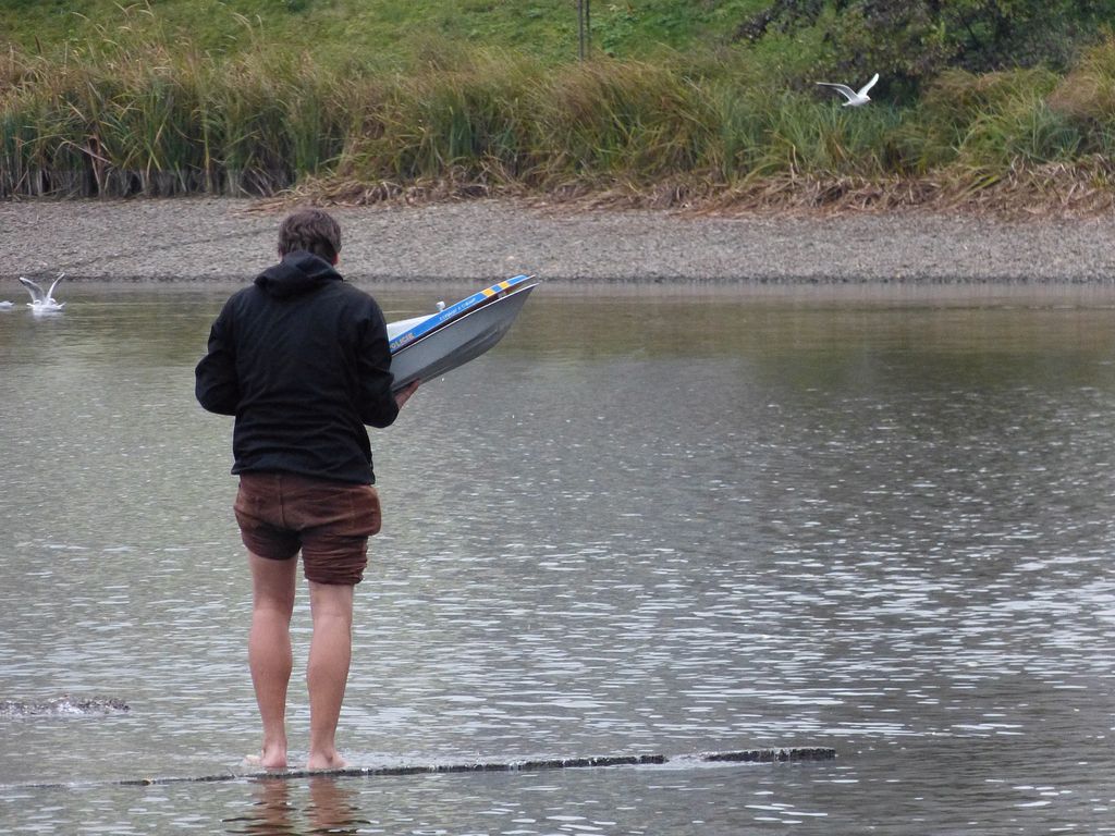 Do soutěže se zapojilo 7 modelářů, přičemž jsme mezi sebou uvítali jednu novou tvář v podobě Michala Moravce, který nasadil hračkovou Caribbean. K jeho smůle jsem ho při jedné z posledních jízd nabral čelenem, který na mé poděděné Footy zbyl. Nejprve se plachetničky nechtěly od sebe vůbec odpoutat, následně se mi podařilo dojet do cíle a Carribean zůstala neřízená na vodní hladině. Springer tak dostal svou příležitost, ovšem na tak malý oplachtěný model jako vhodný záchranář předurčen není. Nicméně po chvíli snažení se záchranná mise podařila.