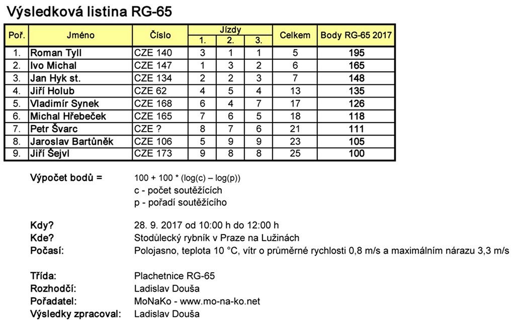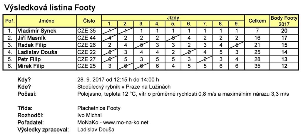 Začali jsme úderem desáté hodiny dopolední soutěží plachetnic RG-65. Do té se zapojilo 9 modelářů. Po třech soutěžních jízdách k velkému překvapení zvítězil MB/RomanT. Po krátké pauze, vyplněné vyhlášením výsledků a zmenšením soutěžní tratě, se na vodu pustily plachetnice třídy Footy v rámci 4. soutěže soutěžního seriálu Footy v Čechách 2017. 6 startujících modelů je hluboko za rekordní účastí na srpnovém Proseku, kde spolu soutěžilo 10 plachetnic. I tak šlo o zajímavé klání ve slabém vánku.