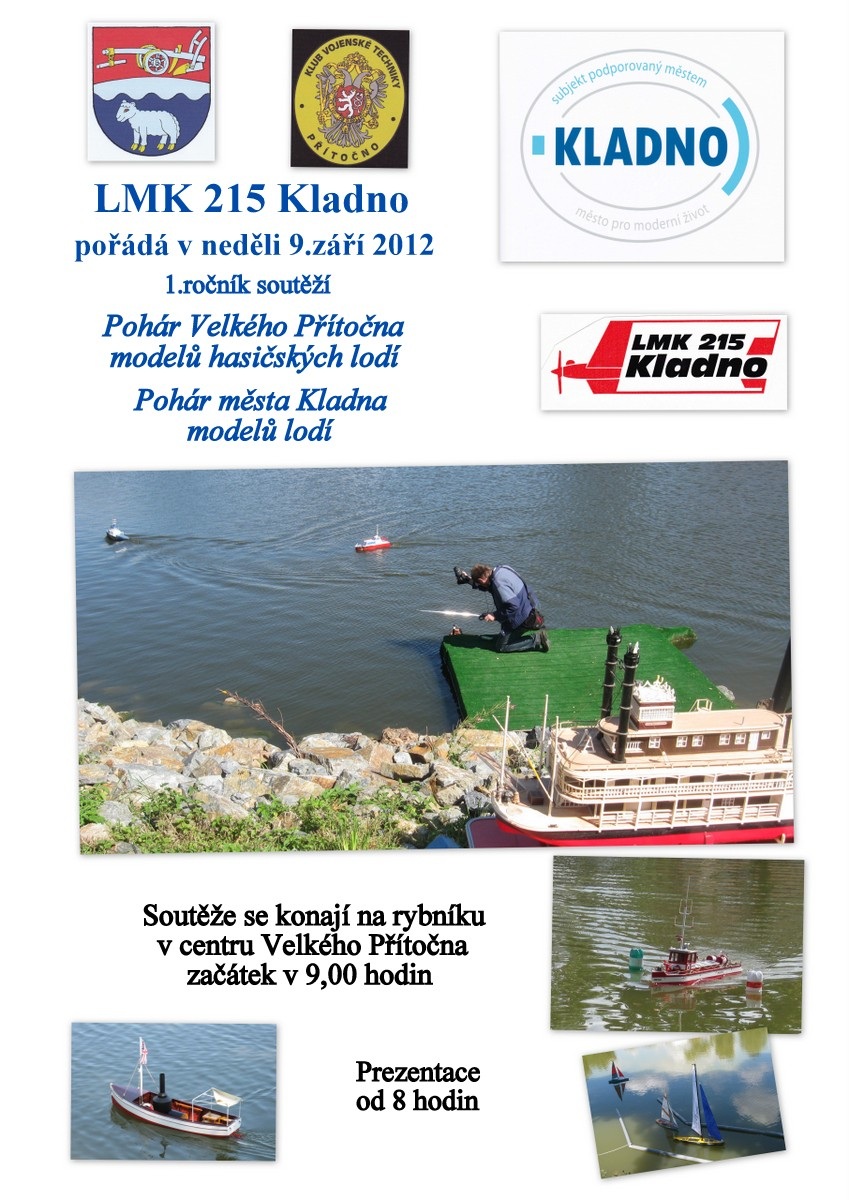 dovoluji si Vás pozvat na první ročník Poháru Velkého Přítočna modelů hasičských lodí (závěrečná soutěž Poháru modelů hasičských lodí 2012) a Poháru města Kladna modelů lodí, jež se uskuteční ve Velkém Přítočně v neděli 9. září 2012 od 9:00 h.
