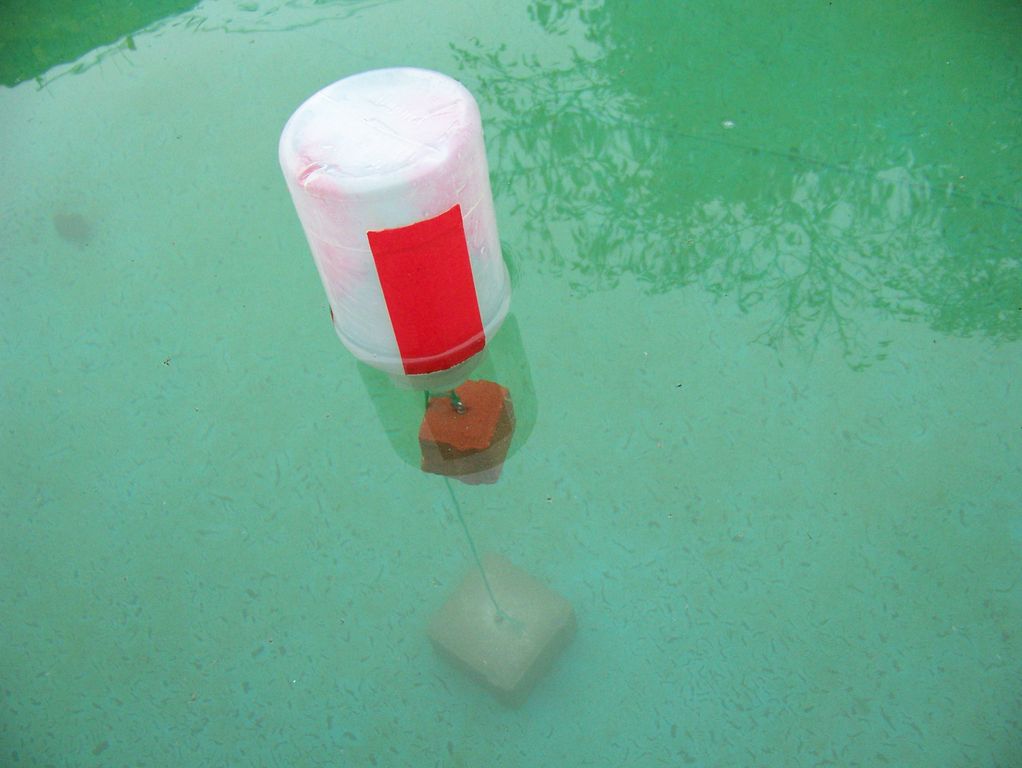 Mnou zvolené bójky pocházejí z litrových umělohmotných láhví s širokým hrdlem z armádního výprodeje, uvnitř kterých je pod víkem kousek překližky, aby závitové očko dobře drželo. Zvenčí jsou pak polepené pruhy barevné lepicí pásky, aby bylo rozeznatelné roztočení bójky při dotyku. Aby taková bójka poslušně stála, tj. byla ponořená do jedné třetiny, použil jsem jako těžší závaží dlaždici čtvercové zámkové dlažby o výšce 6 cm a stranách 10 cm, jejíž hmotnost se po instalaci hmoždinky se závitovým očkem pohybuje kolem 1250 g, jako menší závaží pak posloužila její čtvrtina.