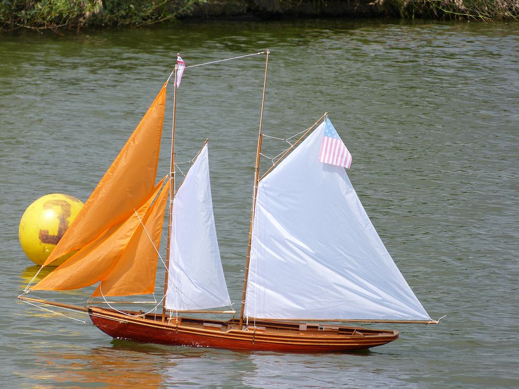 S údivem jsem sledoval, jak si model na své první plavbě povede. Netrvalo dlouho a na bubnu navijáku se zamotalo kevlarové rybářské lano. Jak mi pravil prodavač, udrží stokilového chlapa. Proto není divu, že se mosazný drátek, ztvárňující zavěšení karabiny hlavní plachty, bleskově narovnal. Ještěže tak, také se mohlo stát něco horšího.