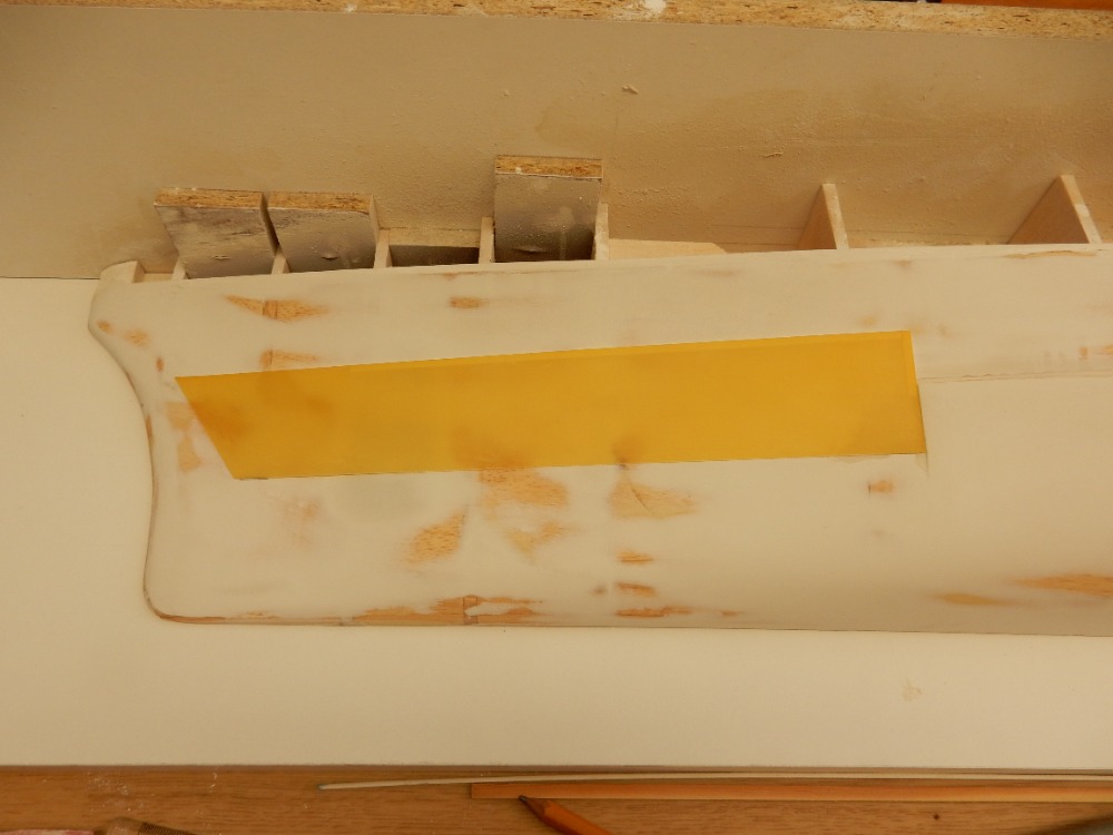 Následuje nalepení jakéhosi ponorového prolisu, který je ve skutečnosti půlkulatého profilu, a probíhá prakticky po celém obvodu lodi. Jeho jakákoli praktická funkce mi uniká. Přivítám vysvětlení (obr. 37).