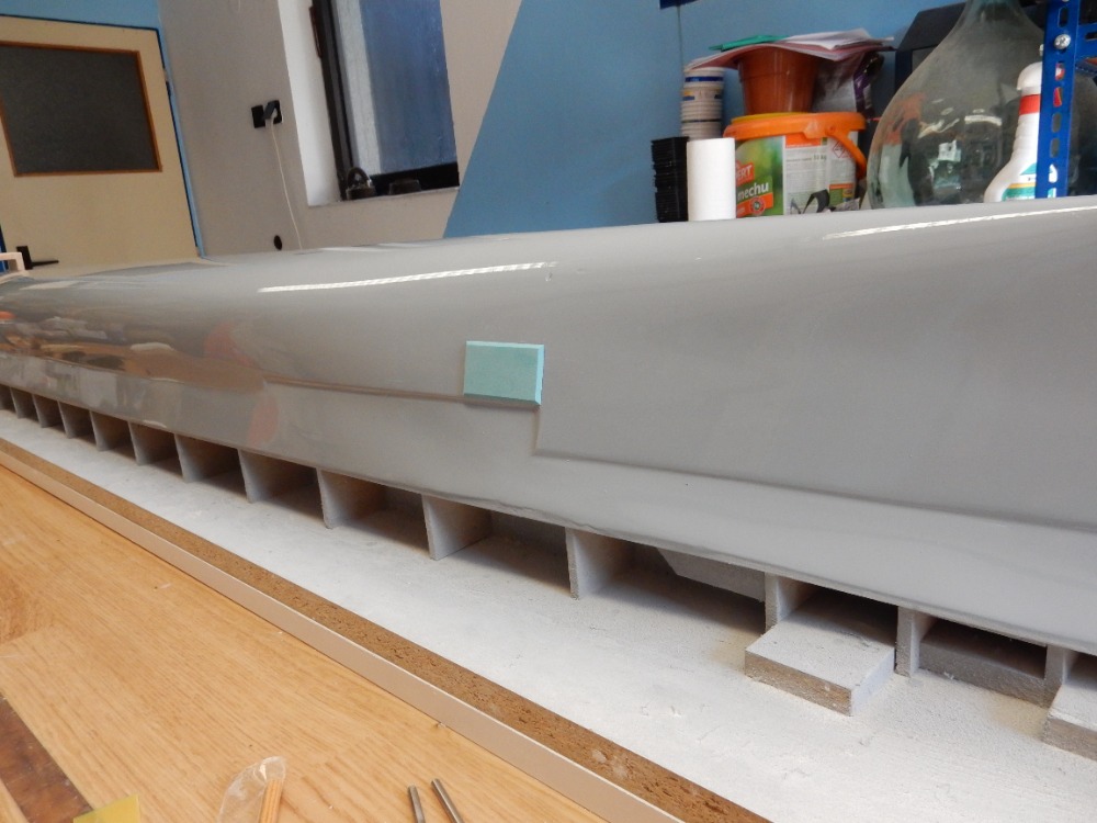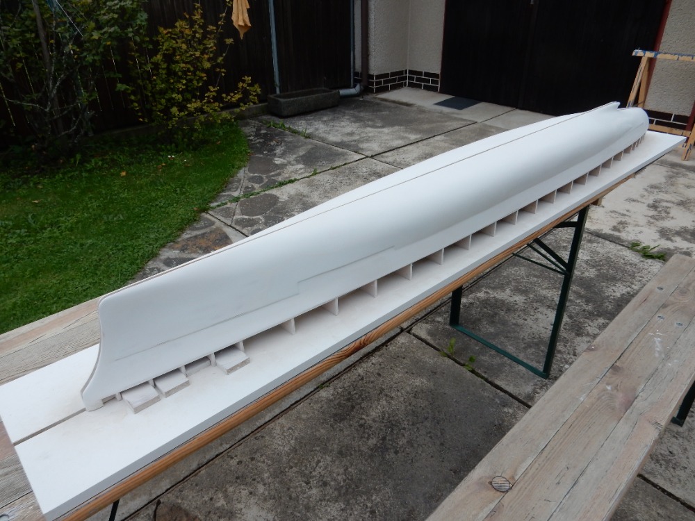 V tomto okamžiku dostává trup první nástřik barvou. Výrobce tmelu FINIŠ uvádí možnost použití jakéhokoli druhu barvy nebo plniče. Nevolil jsem nitro. Brzy schne, ovšem při tomto měřítku trupu až moc rychle. Volil jsem syntetiku, šedou, vysoký lesk. Plnič jsem zavrhl, možná jsem neměl. Trup jsem před nástřikem odmastil lihem. Nástřik proběhl krásně, barva schne dlouho, ale nádherně se rozlila. Ovšem po zaschnutí jsem pozoroval mikro bublinky v povrchu barvy. Po zaschnutí jsem obrousil pod vodou a dal druhý nástřik. Na obrázcích 12 a 13 je výsledek. Myslím, že dostačující.