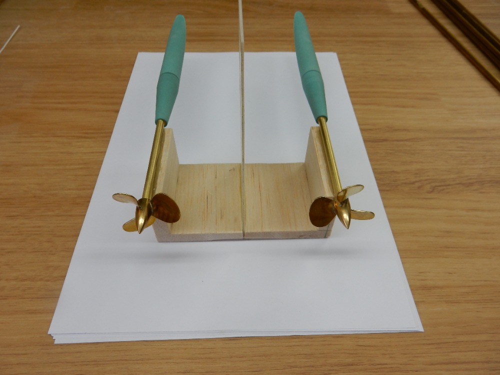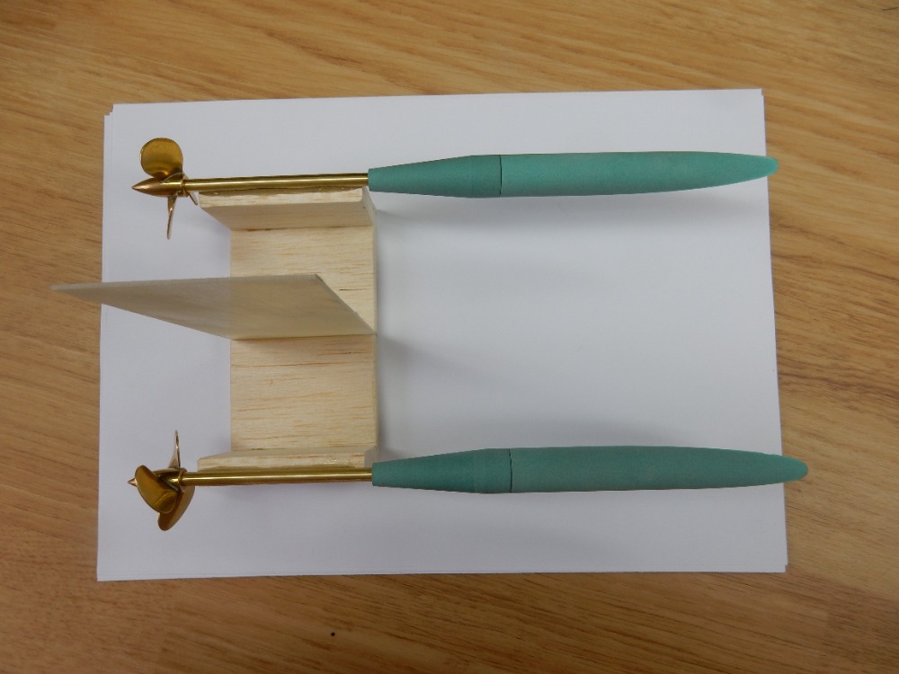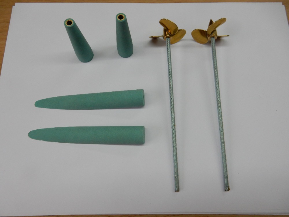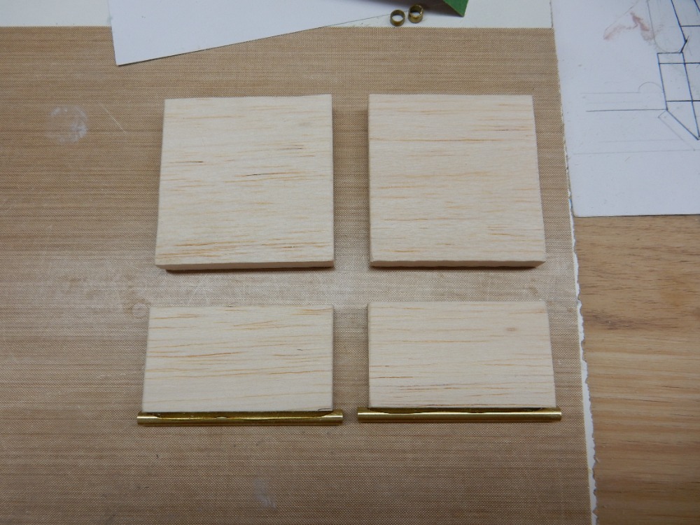 Druhou částí jsou výběhy hřídelů bočních šroubů. Pokusím se v krátkosti popsat přípravek, který zaručí stejný sklon hřídelů, jejich rovnoběžnost vzájemnou i s kýlem lodi. Uříznul jsem dva kusy trubiček o průměru 4 mm tak dlouhých, jako je vzdálenost od trupového výběhu k zadní podpěře šroubu. Zároveň jsem uřízl a zabrousil dva kusy obdélníků z balzy (obr. 16). Trubičky jsem k balzovým dílcům přilepil (obr. 17).