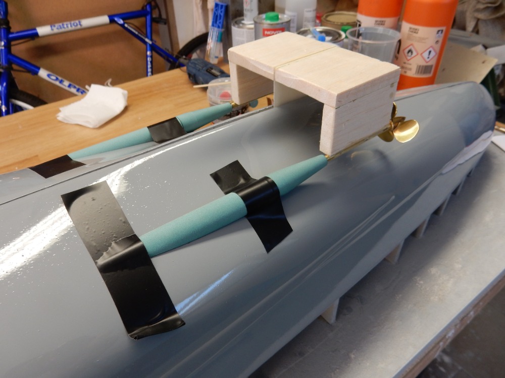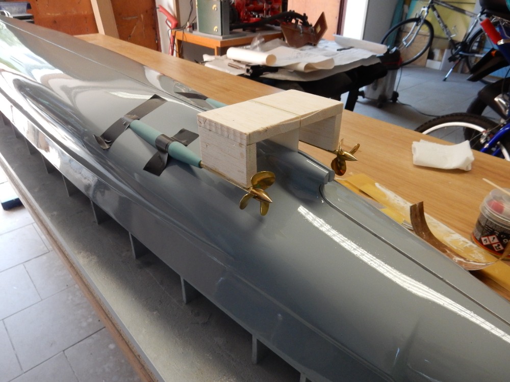 Poslední snímek ukazuje, jak po demontáži můstku a poloviny výběhů zůstávají základní, zkosené části na trupu lodi. Rovnoběžné, stejně skloněné, souměrné s kýlem (osou lodi). Viz obrázek 32. Následuje vytmelení a vybroušení přechodů hřídelových výběhů k trupu tak, jak je tomu ve skutečnosti. Nemá to takto ani jedna stavebnice, není to patrné ani z plánů. Skutečnost odhaluje až foto z vraku lodi (obr. 33). Stačí pomocí patřičně vybroušené stěrky vytmelit a vybrousit (obr. 34 a 35). V barvě to pak nevypadá špatně (obr. 36).