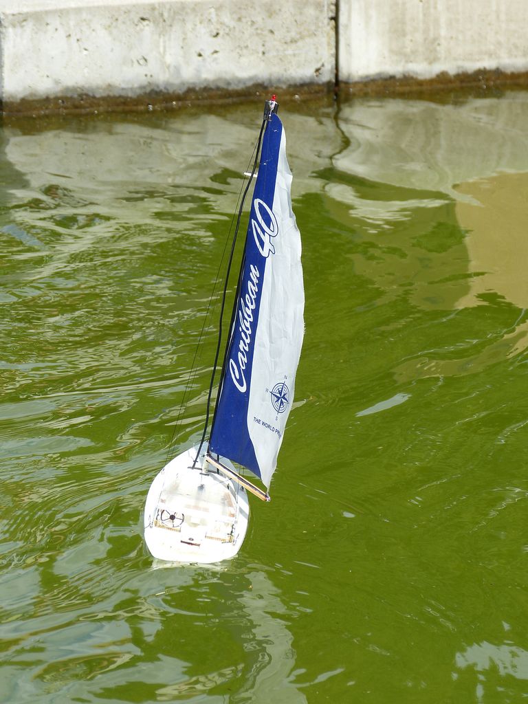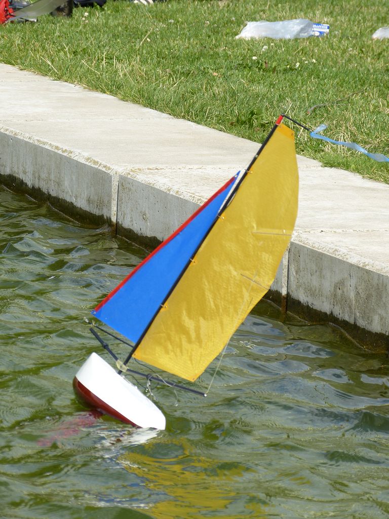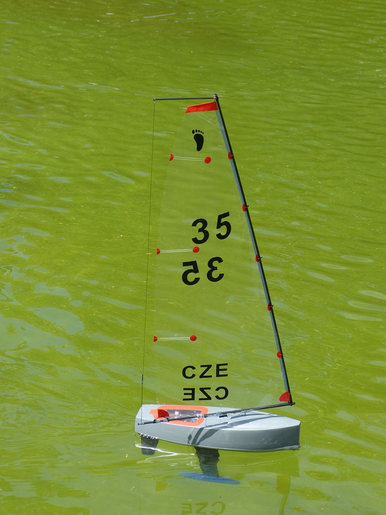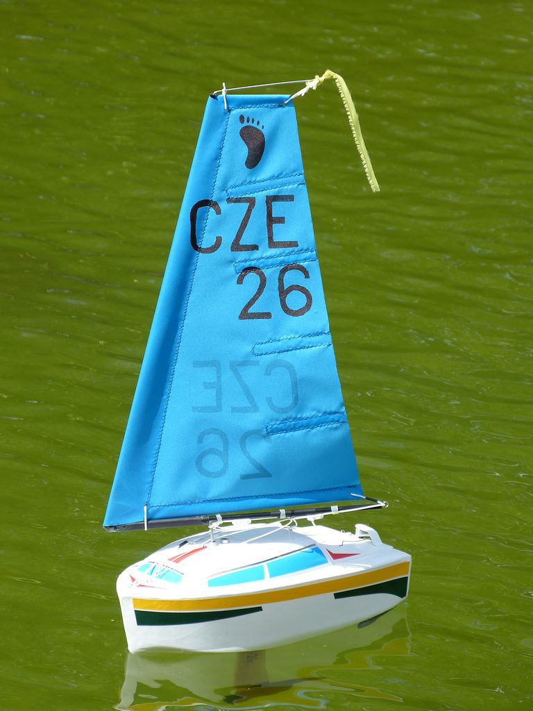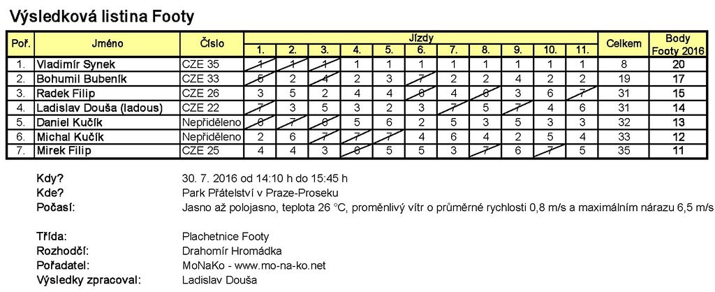 Celkem se nás na start postavilo sedm. Jelikož v parku k mému překvapení celkem svižně foukalo, stihli jsme 11 jízd. Průměrná rychlost větru byla sice jen 0,8 m/s, ale maximální náraz 6,5 m/s, již byl za hranou toho, čemu se u Footy říká pohodová jízda. Zpočátku jsem se po jízdách v náklonech nedivil, že musím co jízdu vylévat vodu z podpalubí, když kolem nástavby voda volně teče, ale pak se vítr utišil, loď stála rovně jako přibitá a vody bylo v útrobách ještě více. Kudy tam teče? Natrženým pouzdrem pro kýl…