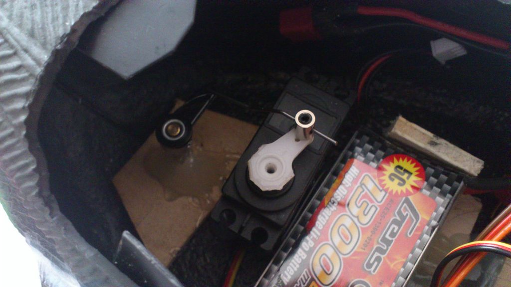 Vymýšlet a stavět domeček na motor, středit s hřídelí se mi vůbec nechtělo, tak jsem koupil hřídel COMPACT od MP JET, kterou jsem pokrátil na požadovanou délku. Stačí ji chvilku ohřát, aby povolilo lepidlo u příruby, ta jde pak lehce sundat a může se řezat. Hřídel jsem usadil do osy a pořádně „oblemcal“ tavným lepidlem, stejně jsem postupoval se servem, jen jsem ho přilepil. Nevím, co za servo to je, asi standartní Hitec (nemá už označení). Plast kachny při použití trochu větší síly všechny komponenty pustí a tavné lepidlo jde také dobře sundat.